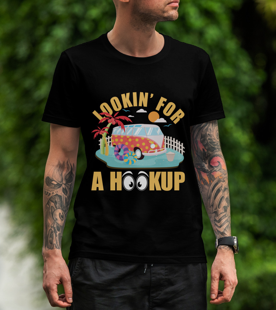 Lookin' For A Hookup Camper Van Beach Scene With Palm Tree And Sun T-Shirt