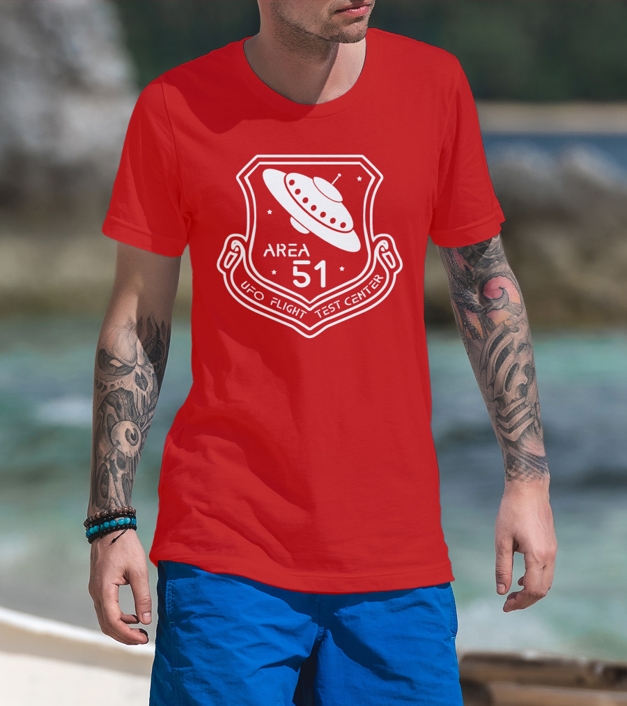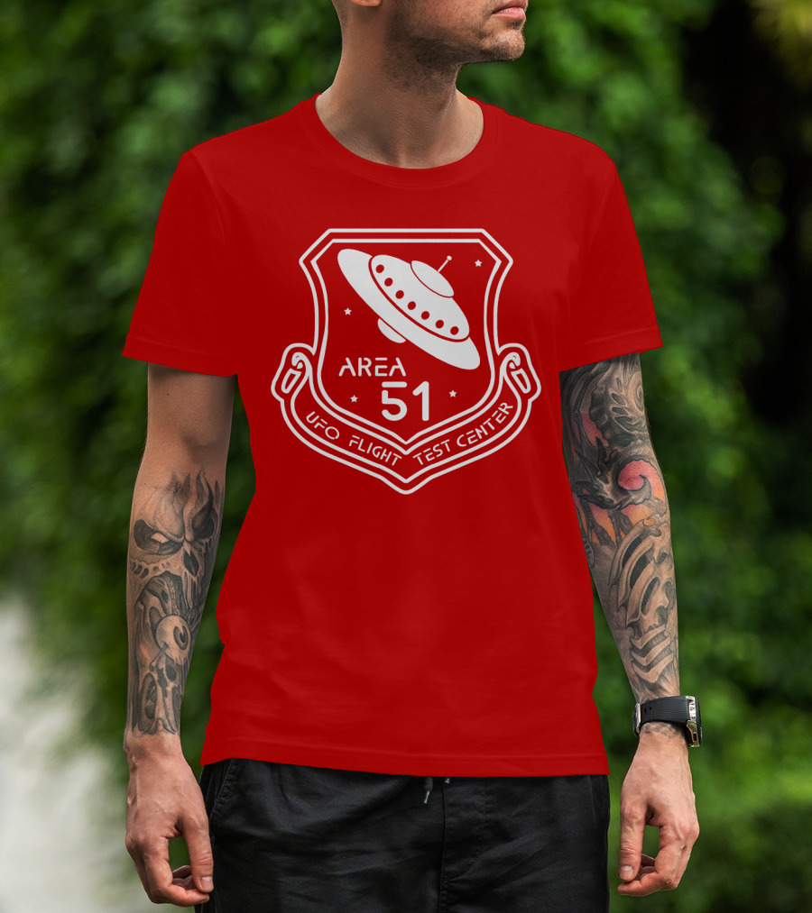 The Area 51 UFO Flight Test Center Badge with Flying Saucer Emblem T-shirt is designed for everyday wear and a consistent fit. Fabric is pre-shrunk ring-spun cotton with durable stitching. See the size chart below for exact measurements.