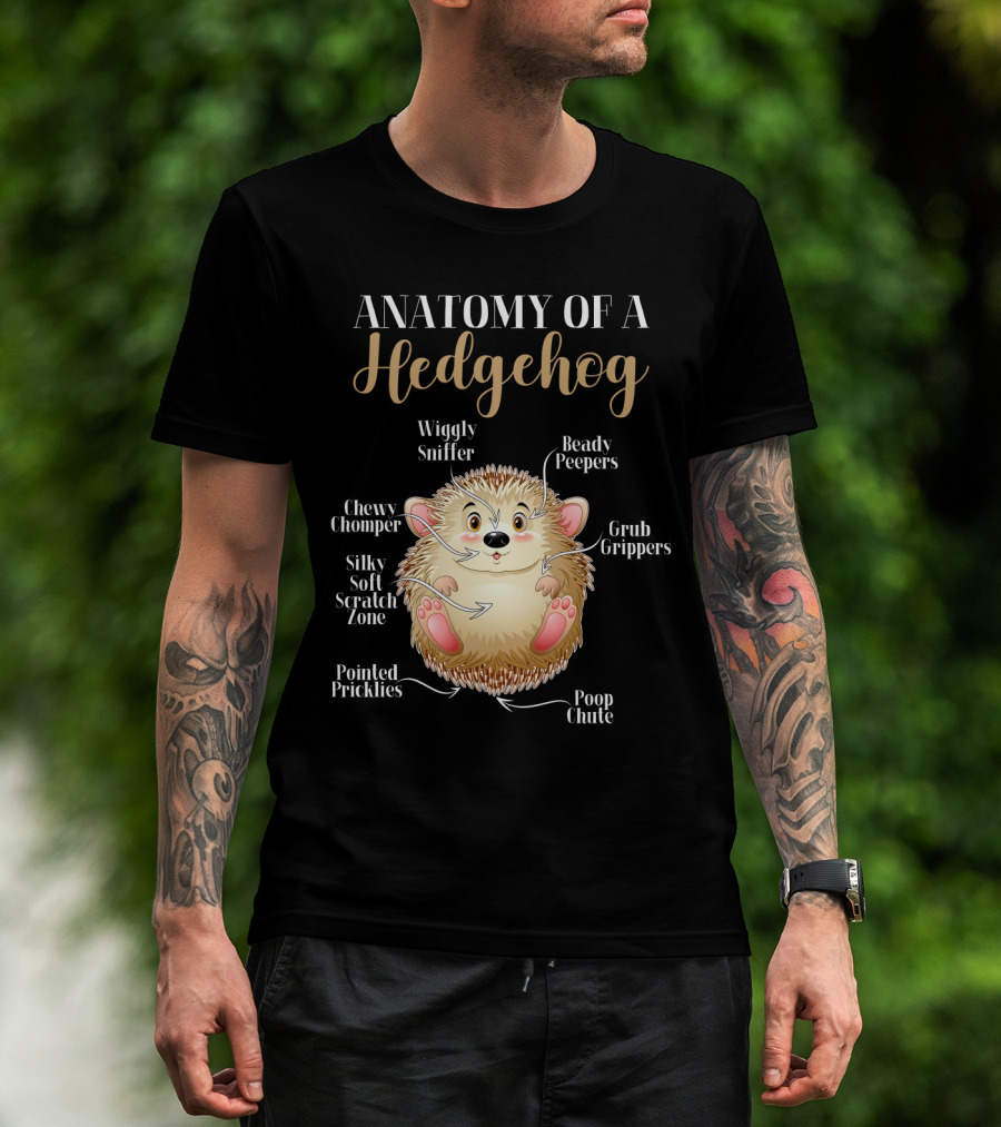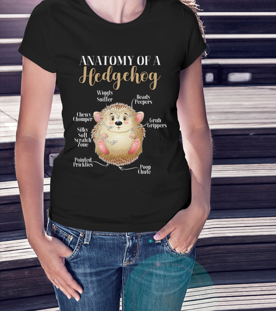 ANATOMY OF A HEDGEHOG Wiggly Sniffer Beady Peepers Grub Grippers Chewy Chomper Silky Soft Scratch Zone Pointed Pricklies Poop Chute T-Shirt