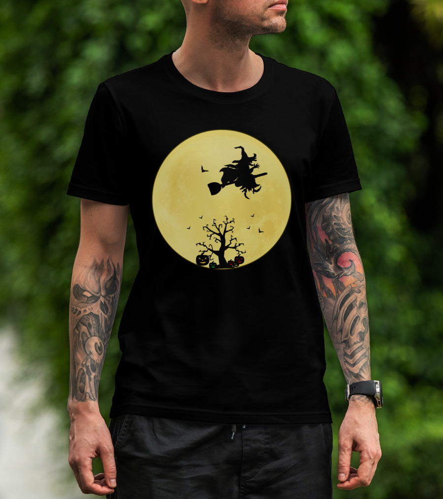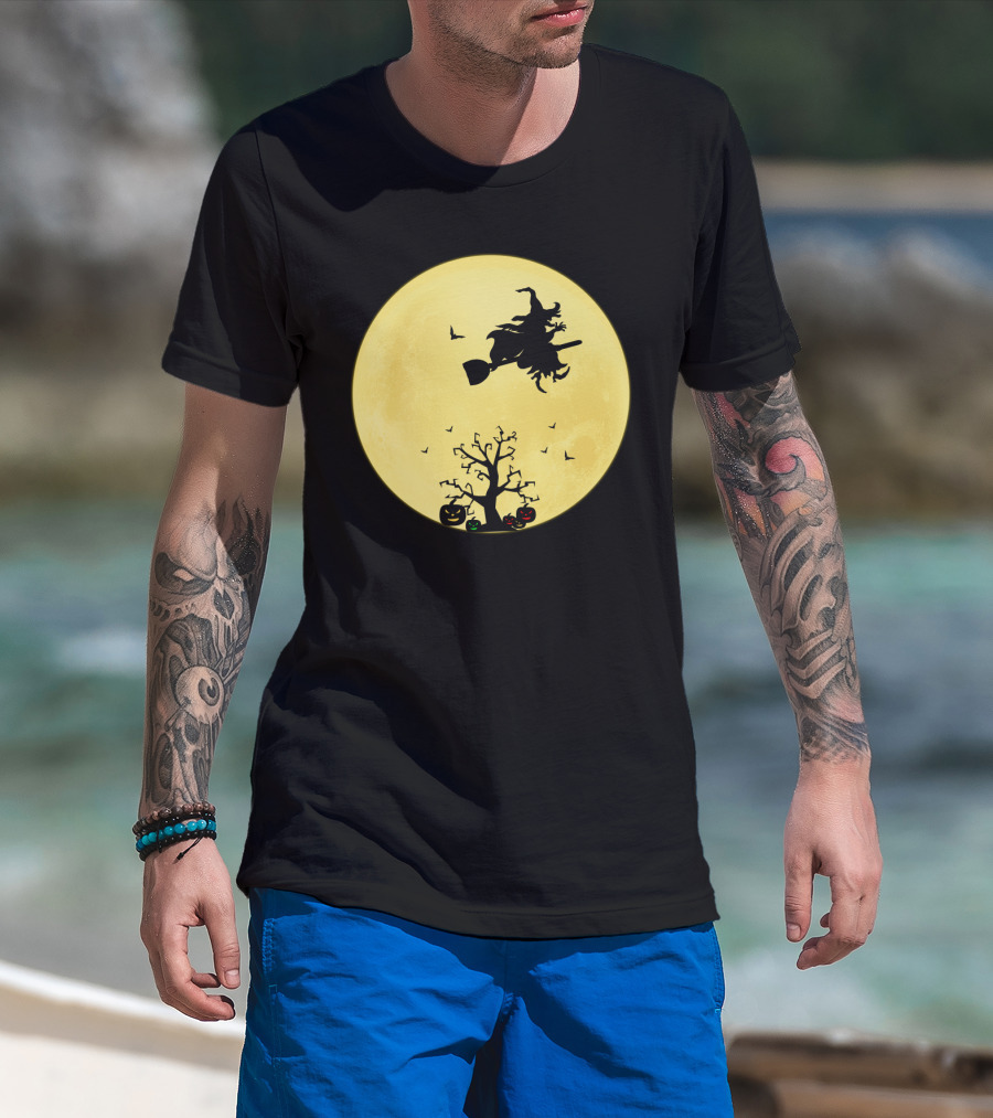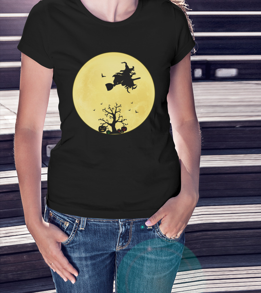 Halloween Witch Flying On Broomstick Over Full Moon With Jack-O'-Lanterns T-Shirt