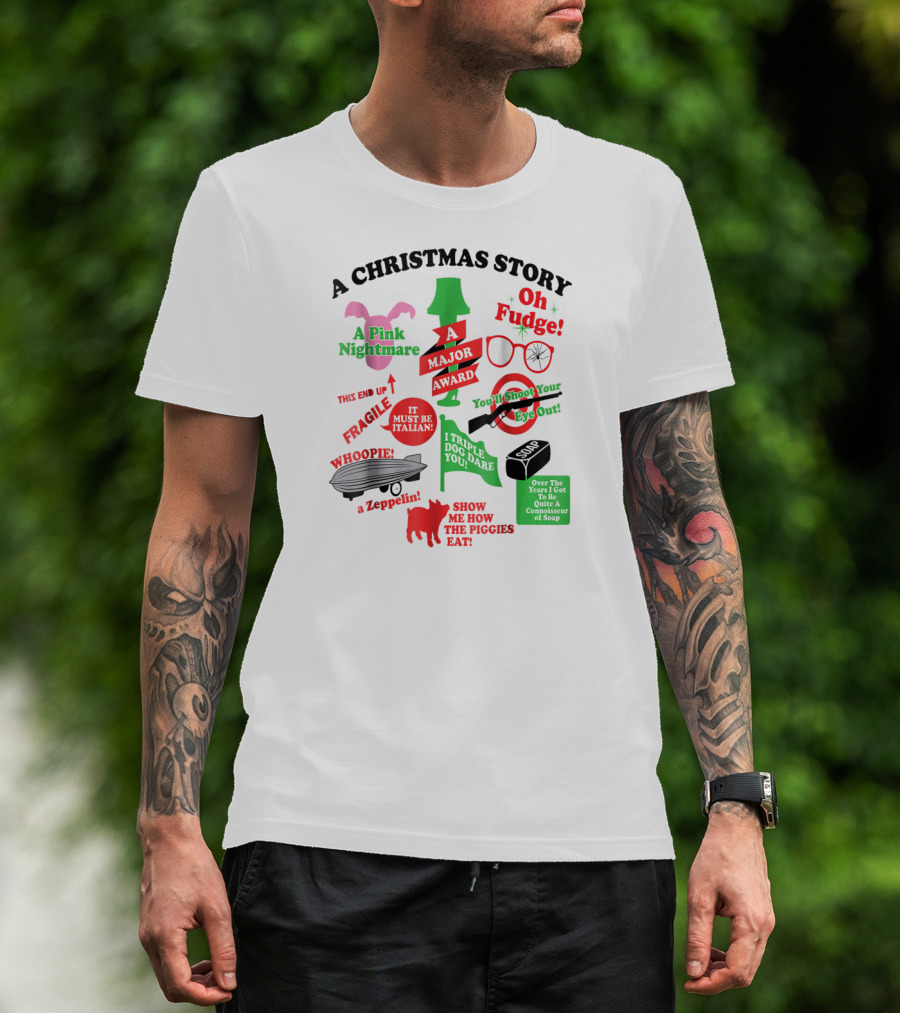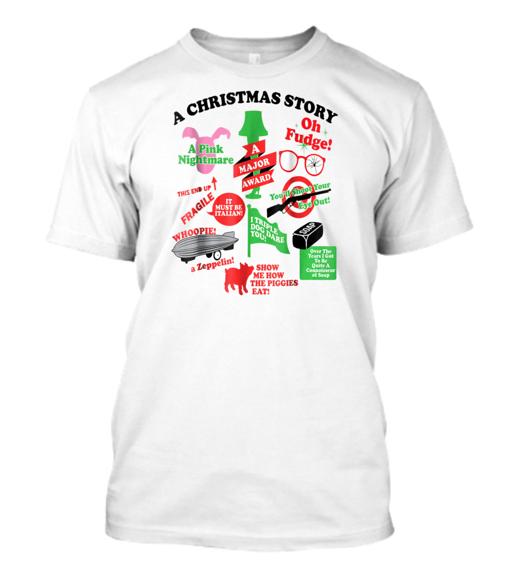 The A Christmas Story A Major Award You'll Shoot Your Eye Out Oh Fudge Fragile Pink Nightmare T-shirt is designed for everyday wear and a consistent fit. Fabric is pre-shrunk ring-spun cotton with durable stitching. See the size chart below for exact measurements.
