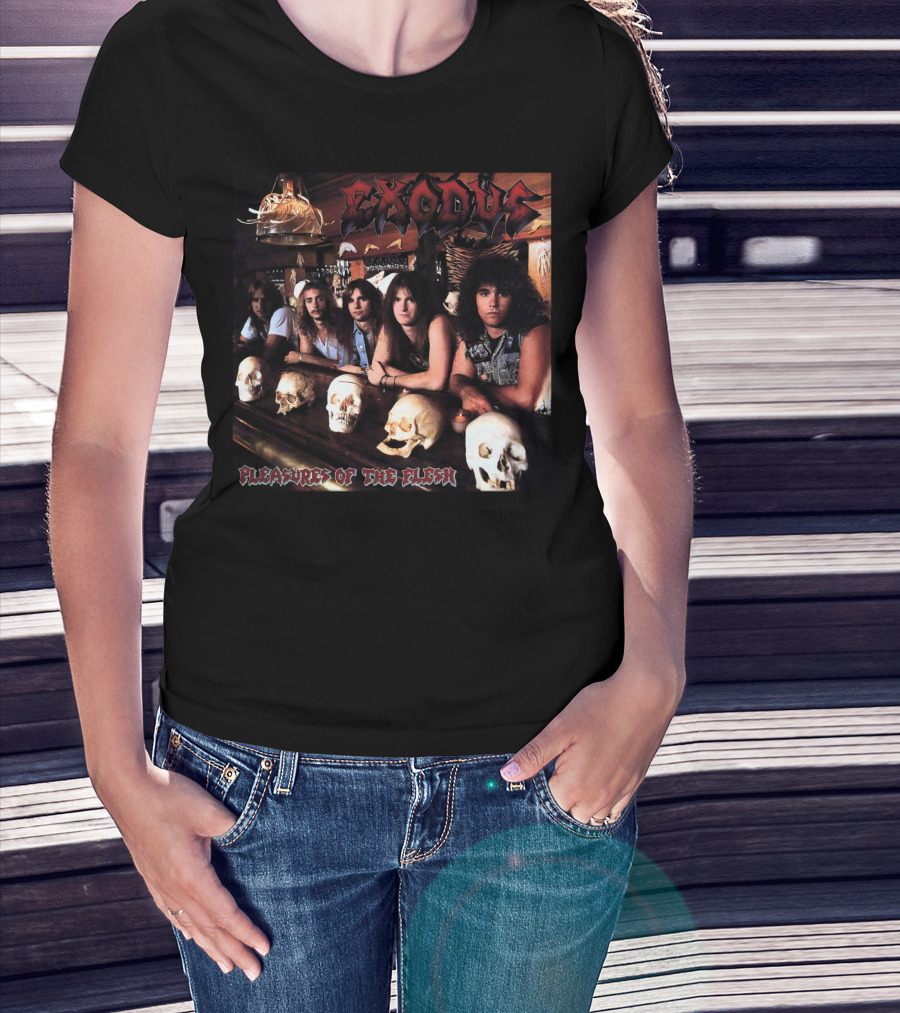 Exodus Pleasures Of The Flesh Album Cover With Band Members And Skulls T-Shirt