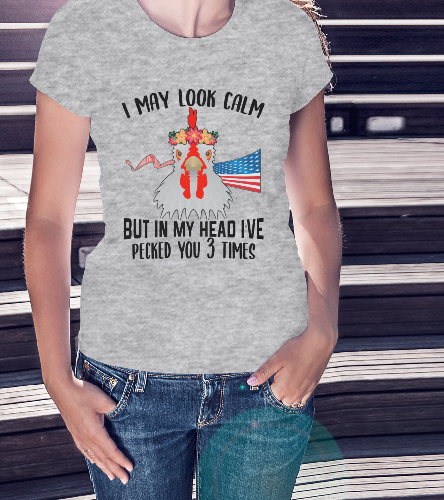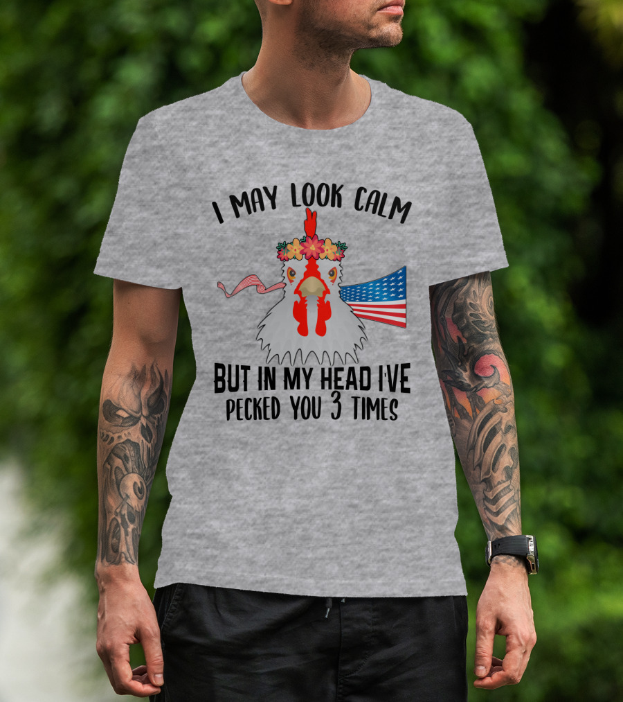 I May Look Calm Chicken With Flower Crown And American Flag Pecked You 3 Times T-Shirt