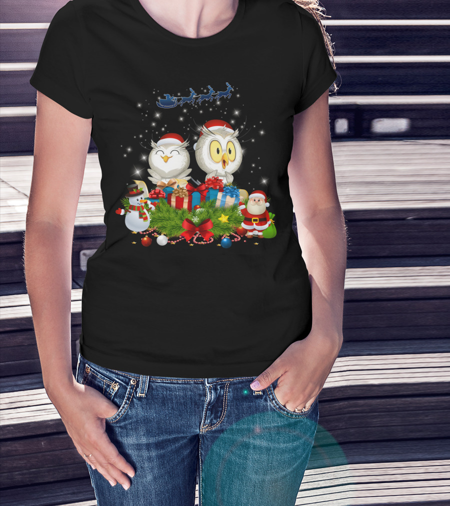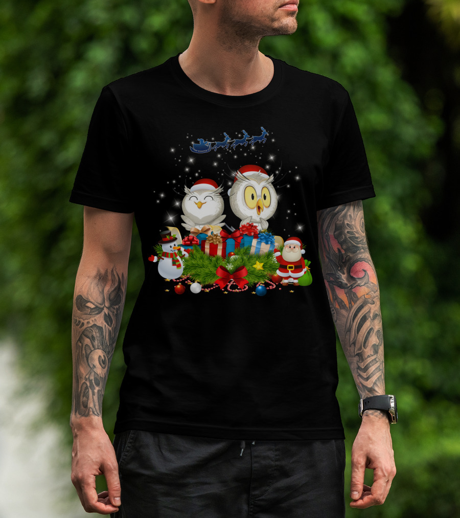 Waiting For Santa Owls With Gifts And Snowman Scene T-Shirt