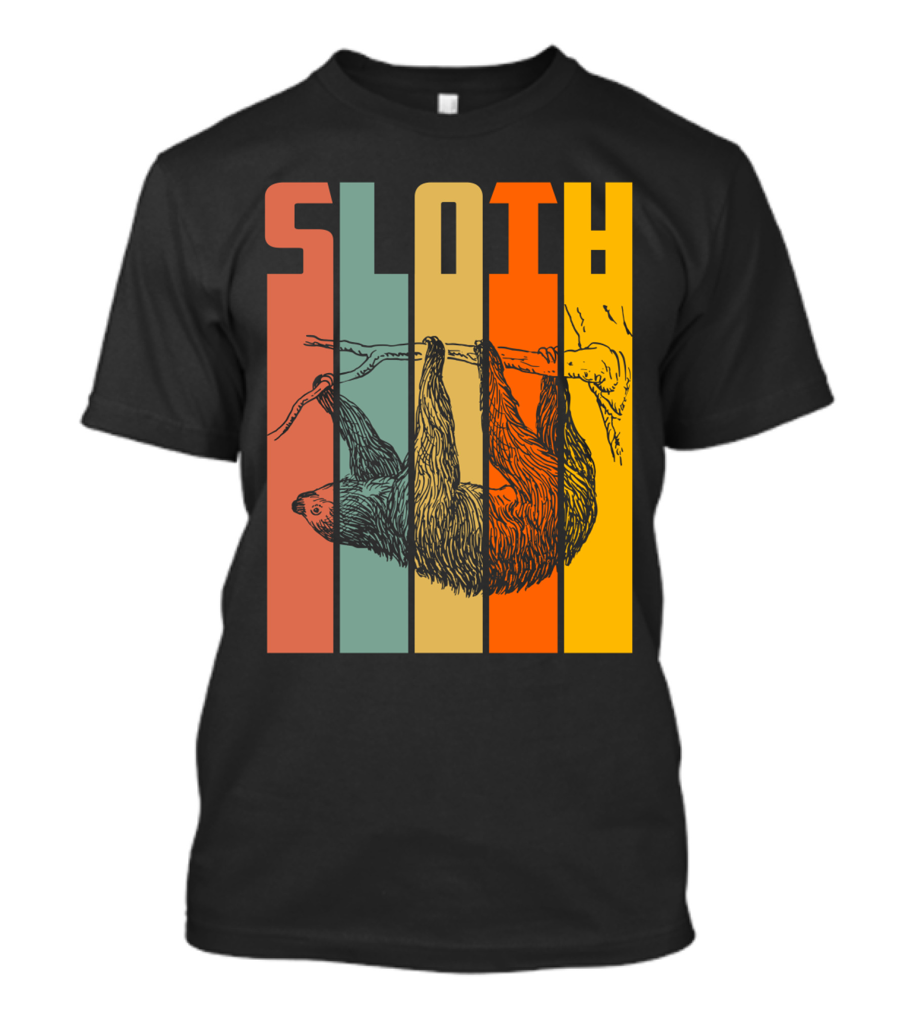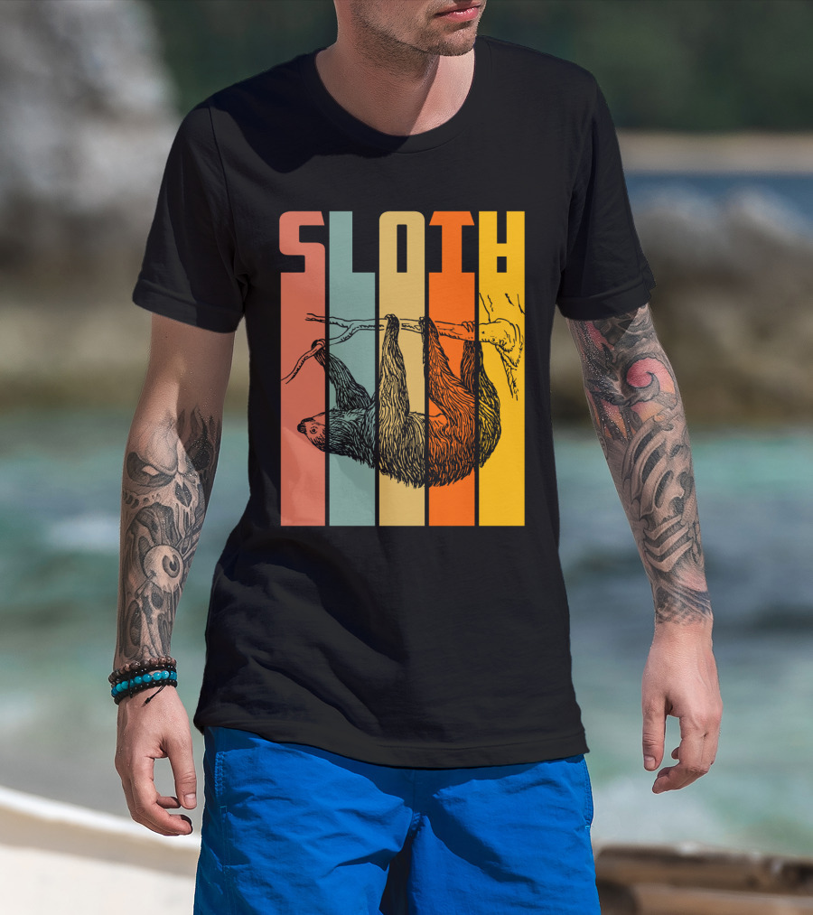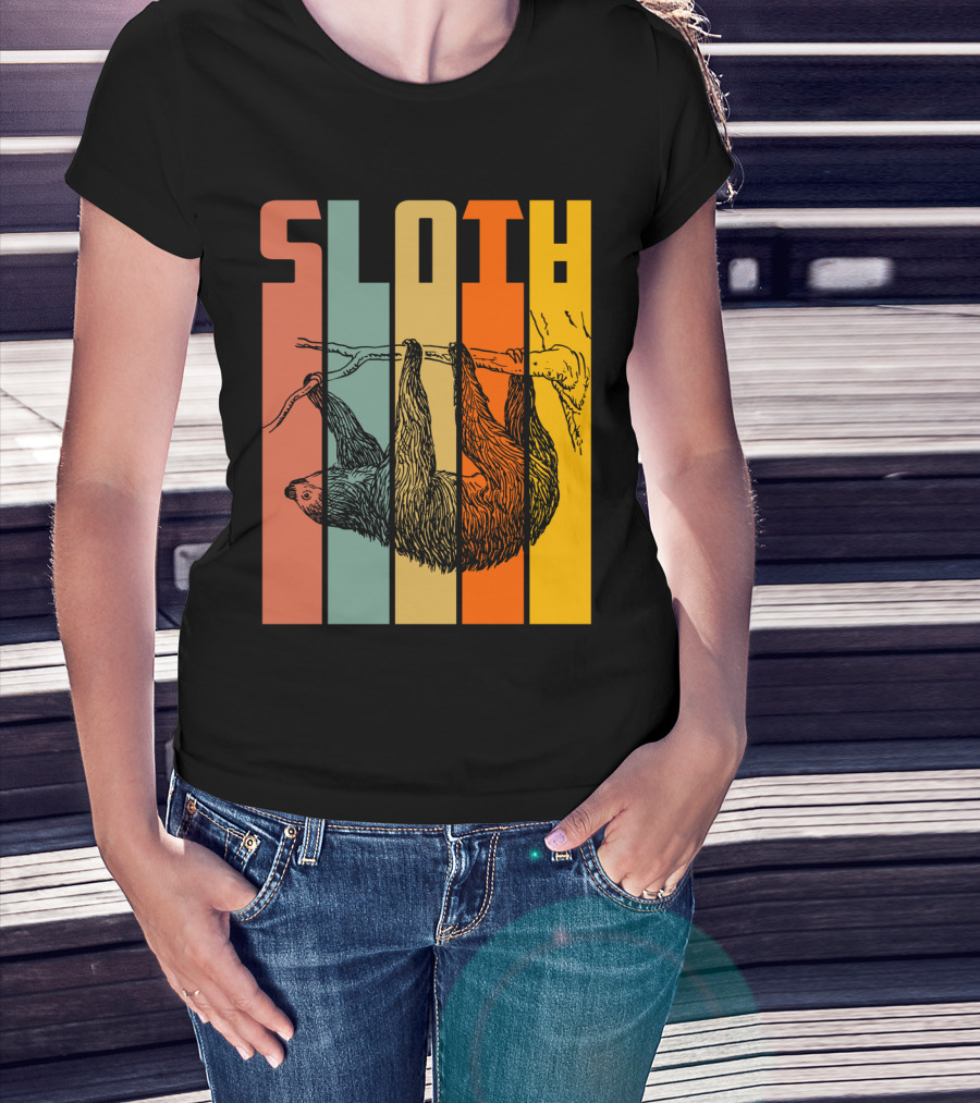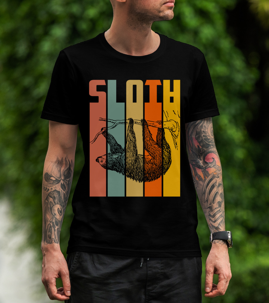 The SLOTH Vintage Retro Hanging Branch Stripes T-shirt is designed for everyday wear and a consistent fit. Fabric is pre-shrunk ring-spun cotton with durable stitching. See the size chart below for exact measurements.