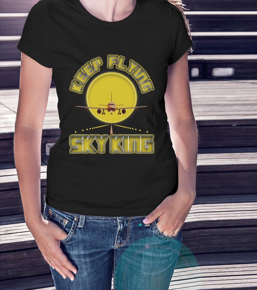 The Keep Flying Sky King Aviation Pilot Airplane Jet Landing Sunset T-shirt is designed for everyday wear and a consistent fit. Fabric is pre-shrunk ring-spun cotton with durable stitching. See the size chart below for exact measurements.