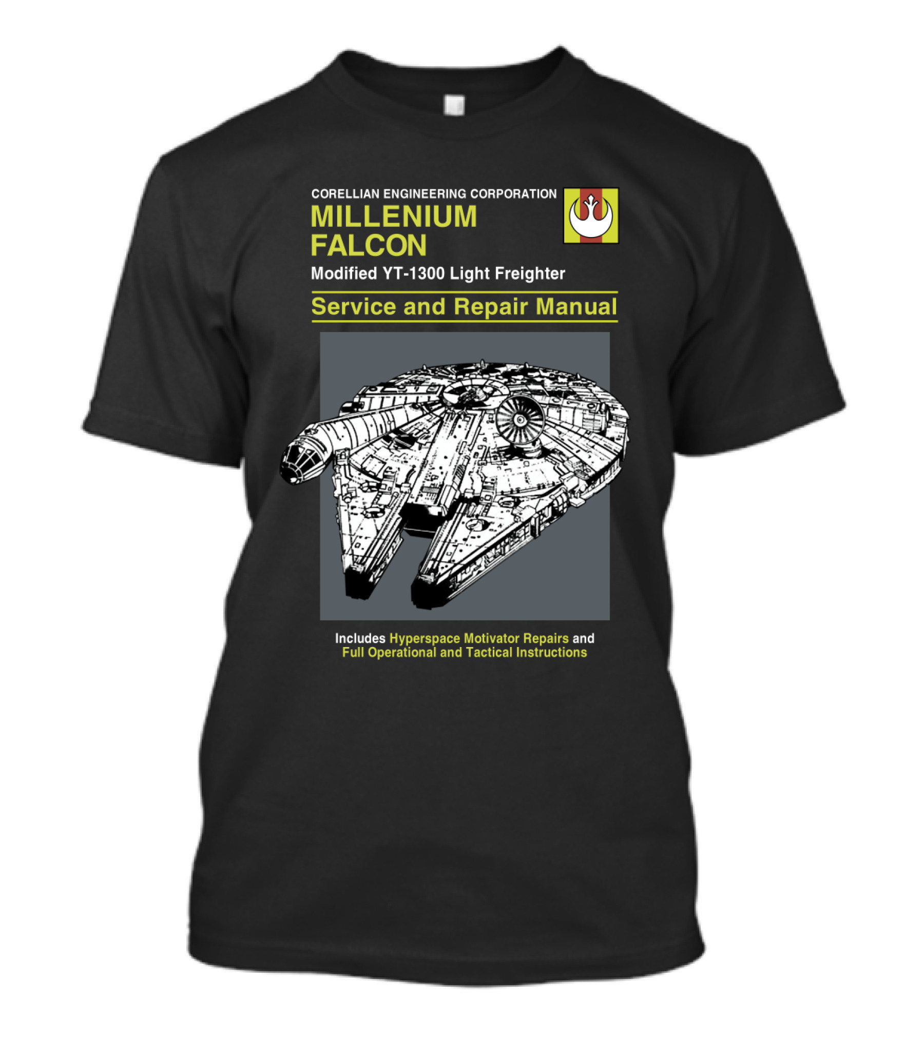 The Corellian Engineering Corporation Millennium Falcon Modified YT-1300 Light Freighter Service and Repair Manual Star Wars T-shirt is designed for everyday wear and a consistent fit. Fabric is pre-shrunk ring-spun cotton with durable stitching. See the size chart below for exact measurements.