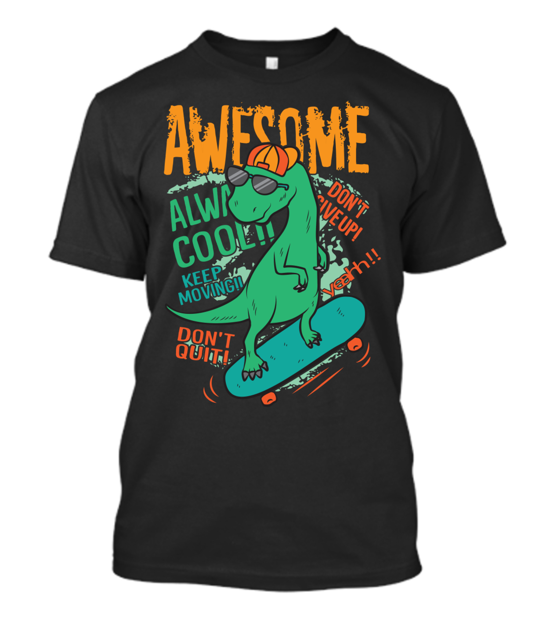 The Awesome Alway Cool Dinosaur Keep Moving Don't Quit Skateboard T-shirt is designed for everyday wear and a consistent fit. Fabric is pre-shrunk ring-spun cotton with durable stitching. See the size chart below for exact measurements.