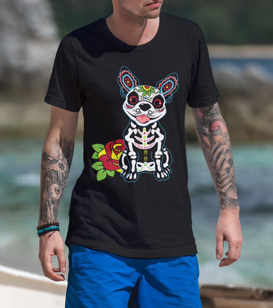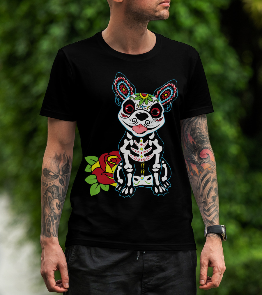 Boston Terrier Sugar Skull With Red Rose Day Of The Dead T-Shirt