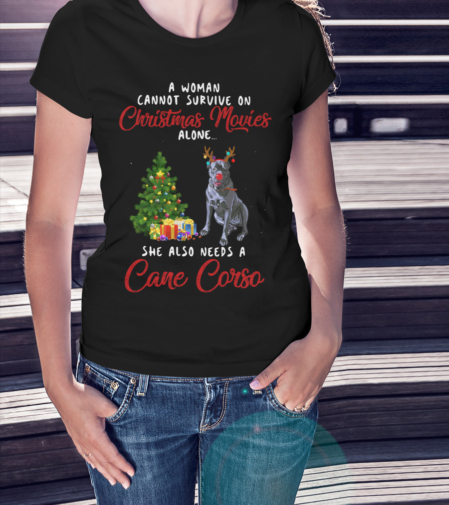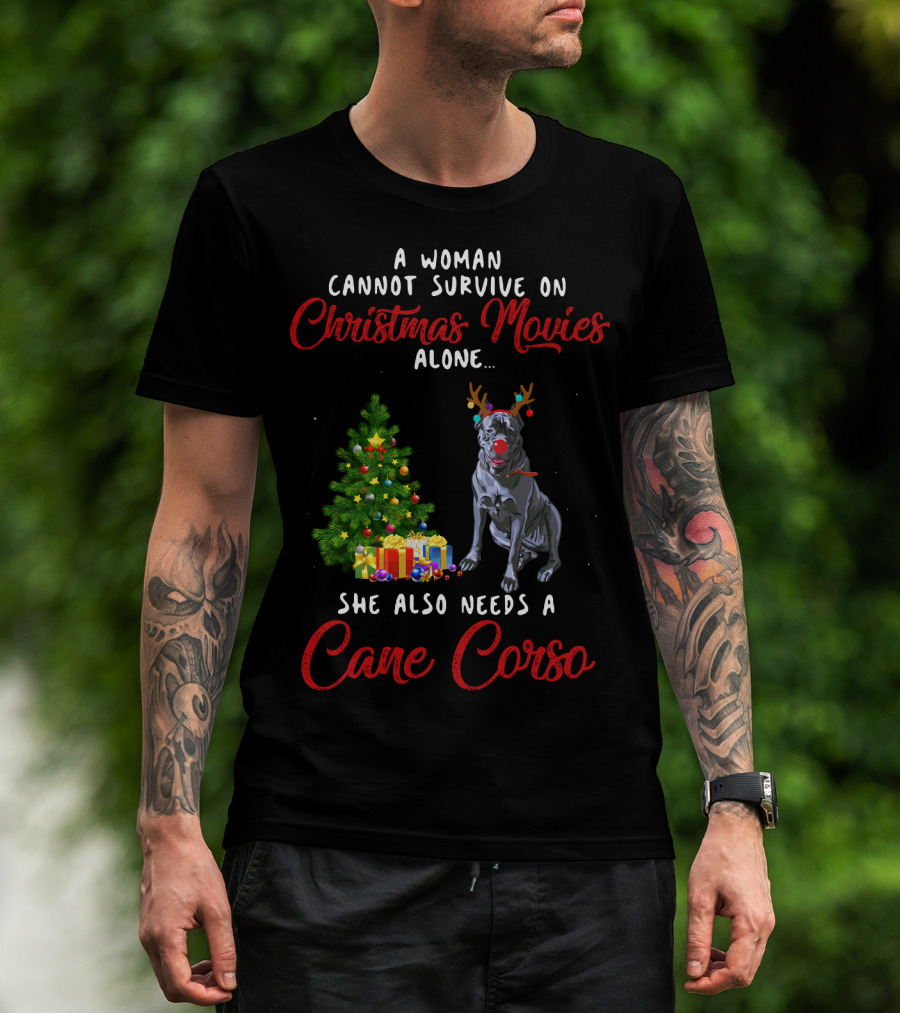 A Woman Cannot Survive On Christmas Movies Alone She Also Needs A Cane Corso Holiday T-Shirt