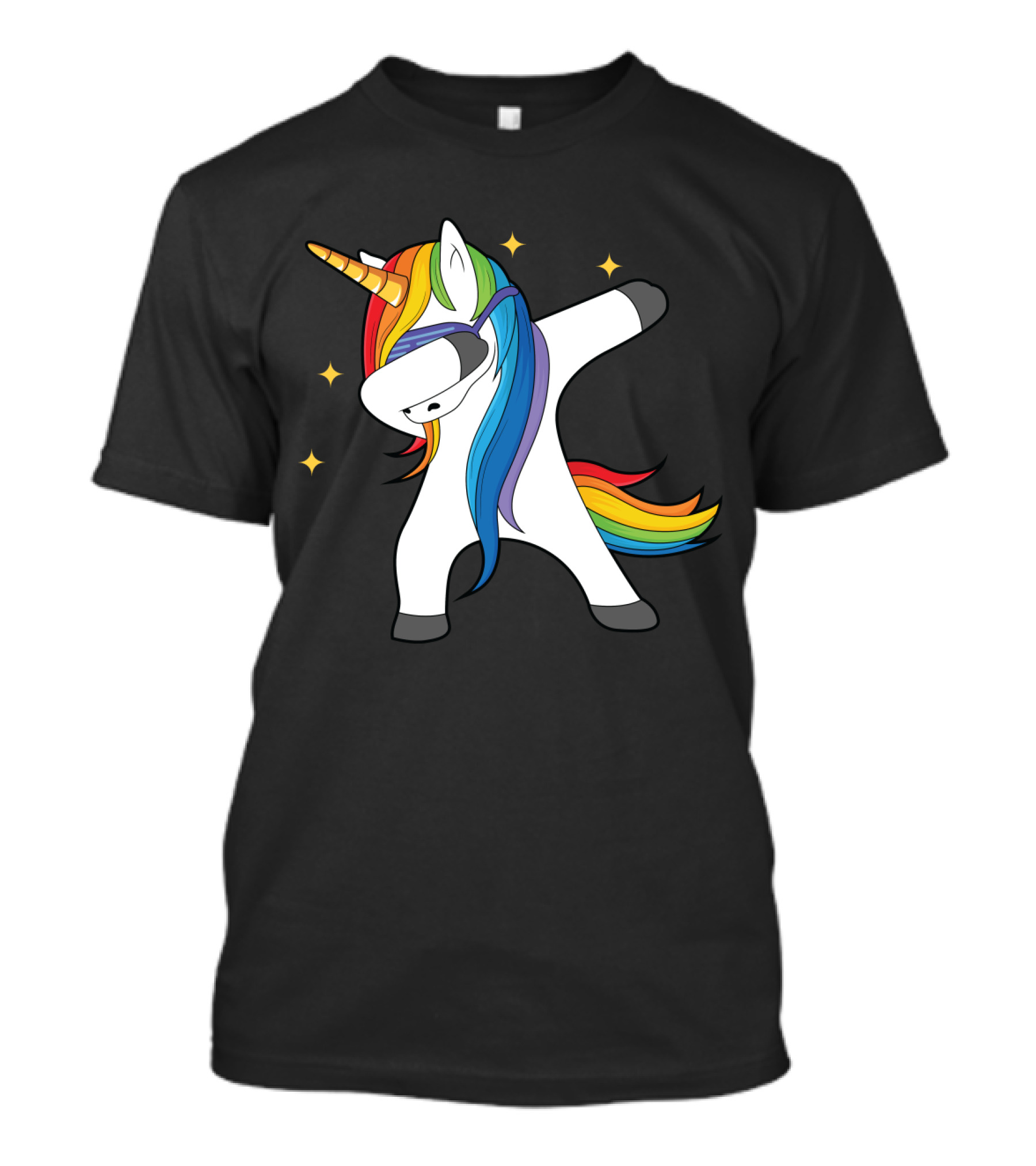 The Unicorn Dabbing with Rainbow Mane and Stars T-shirt is designed for everyday wear and a consistent fit. Fabric is pre-shrunk ring-spun cotton with durable stitching. See the size chart below for exact measurements.