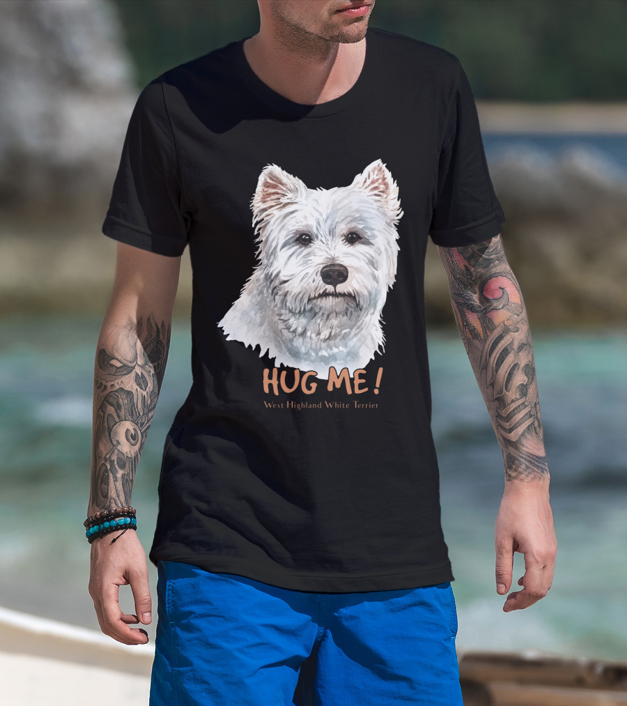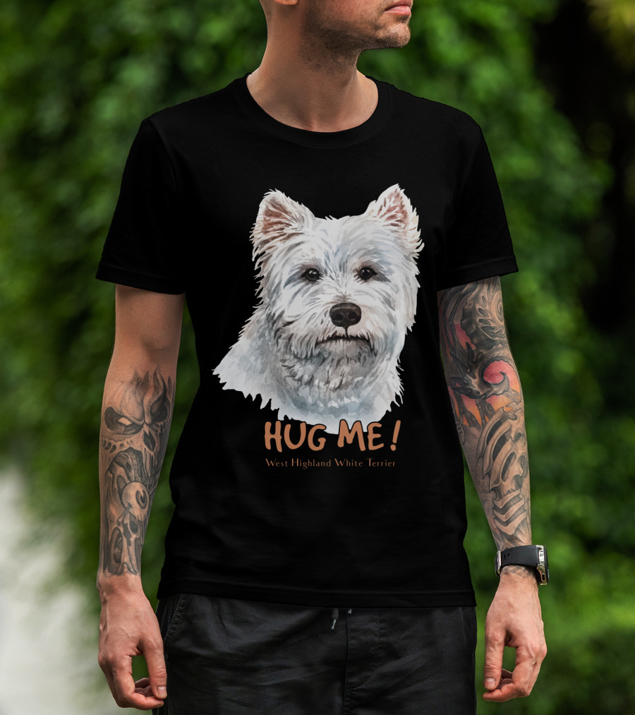 The Hug Me West Highland White Terrier T-shirt is designed for everyday wear and a consistent fit. Fabric is pre-shrunk ring-spun cotton with durable stitching. See the size chart below for exact measurements.