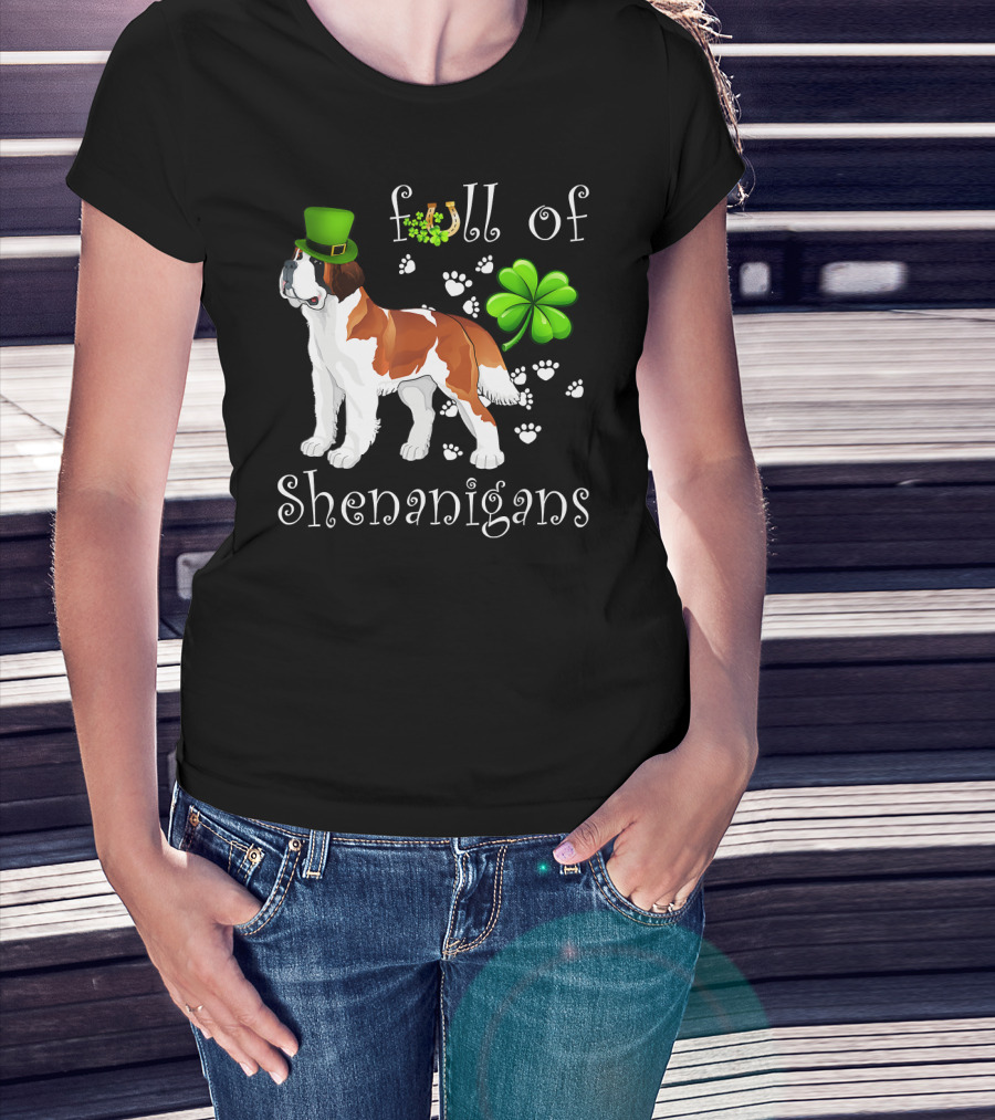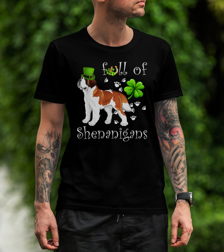 Full Of Shenanigans St Bernard Dog With Shamrock Hat And Paw Prints T-Shirt
