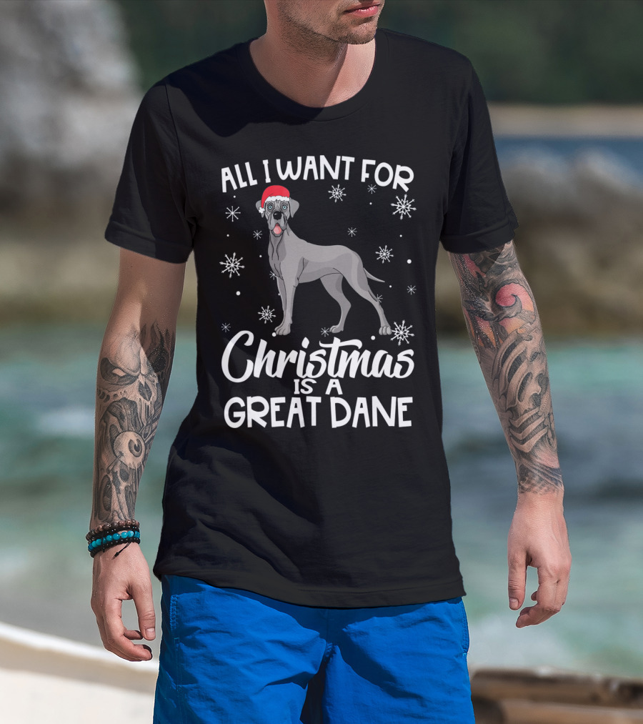 All I Want For Christmas Is A Great Dane With Santa Hat And Snowflakes T-Shirt