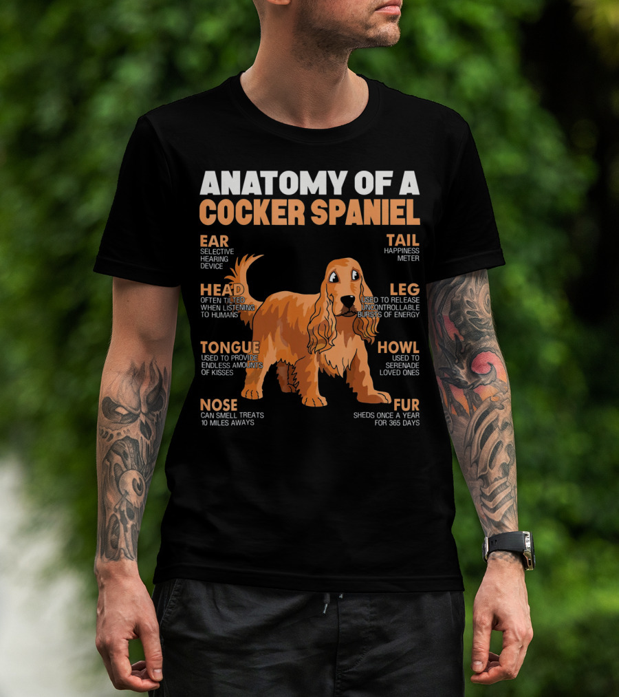 The ANATOMY OF A COCKER SPANIEL HEAD TONGUE NOSE EAR FUR LEG TAIL HOWL T-shirt is designed for everyday wear and a consistent fit. Fabric is pre-shrunk ring-spun cotton with durable stitching. See the size chart below for exact measurements.