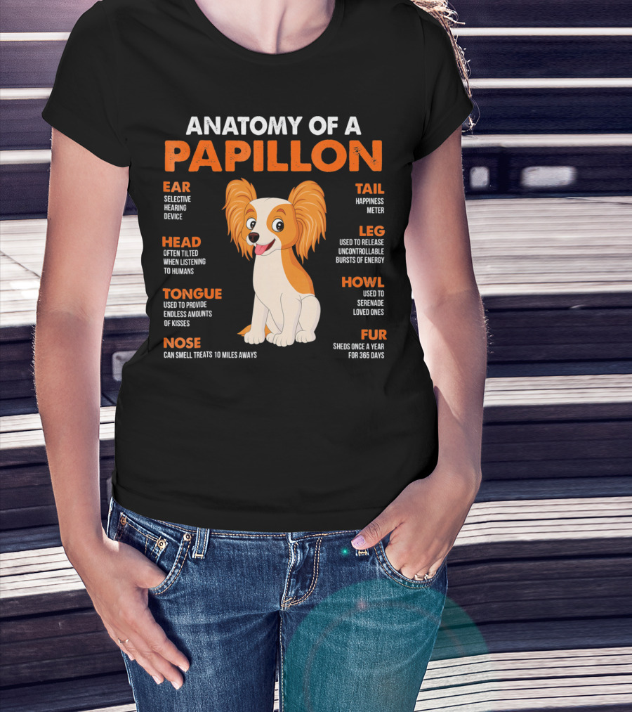 The ANATOMY OF A PAPILLON EAR HEAD TONGUE NOSE TAIL LEG HOWL FUR T-shirt is designed for everyday wear and a consistent fit. Fabric is pre-shrunk ring-spun cotton with durable stitching. See the size chart below for exact measurements.