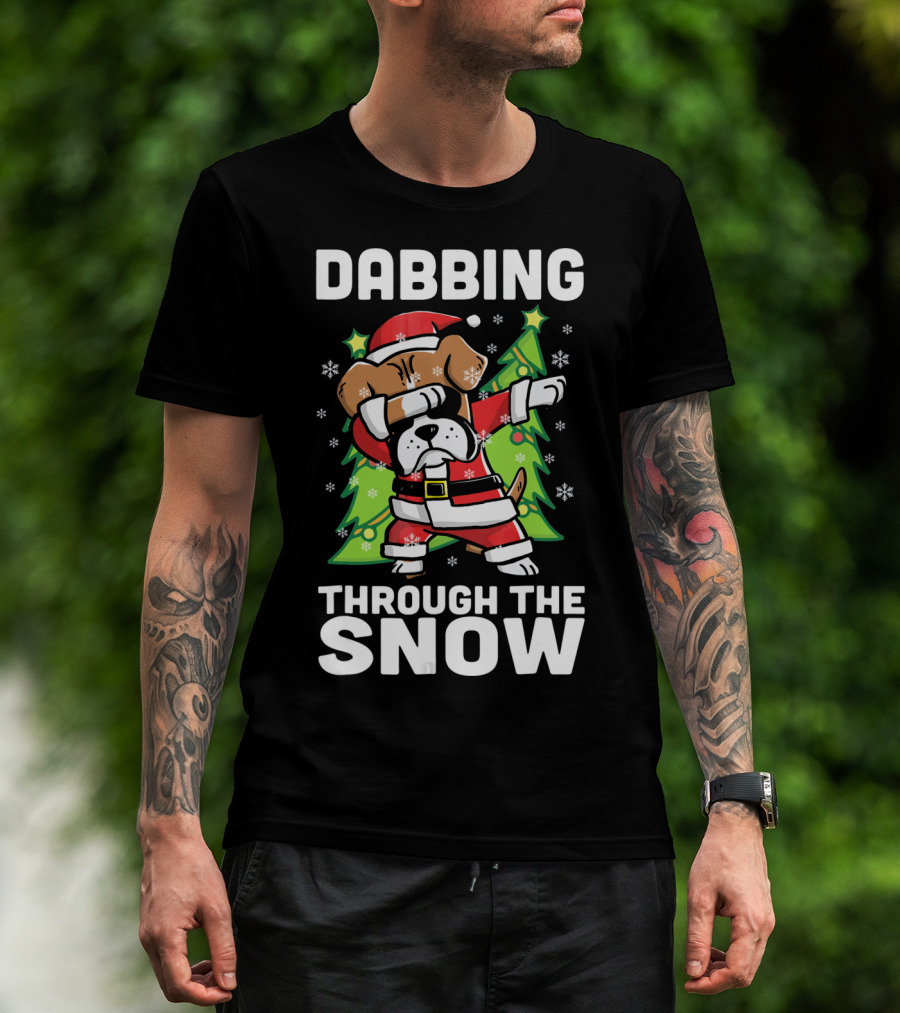 The Dabbing Through The Snow Boxer Dog Santa Christmas Snowflakes Pine Trees T-shirt is designed for everyday wear and a consistent fit. Fabric is pre-shrunk ring-spun cotton with durable stitching. See the size chart below for exact measurements.