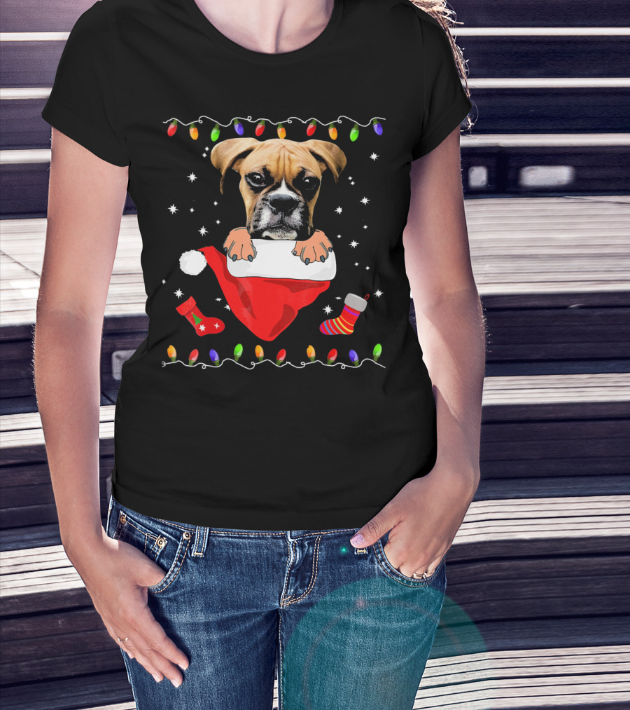 Festive Boxer Dog Christmas With Santa Hat And Holiday Lights T-Shirt