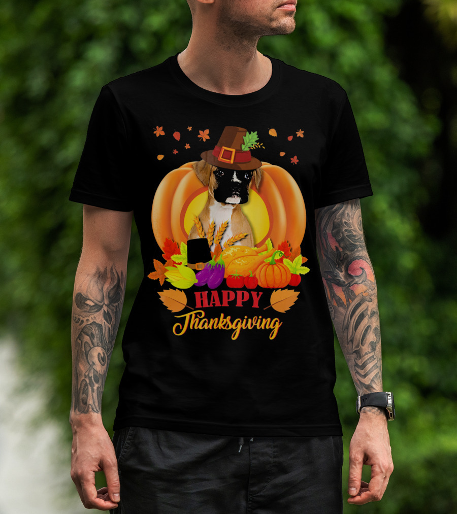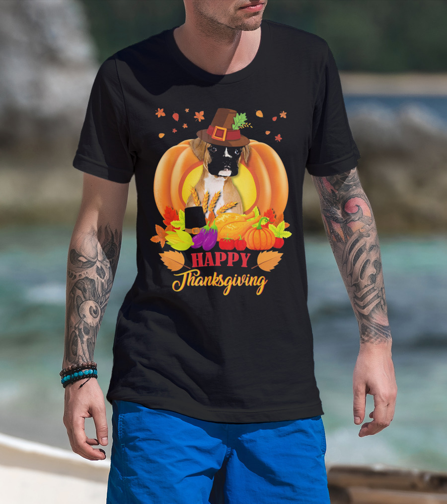 Boxer Dog In Pilgrim Hat Happy Thanksgiving Pumpkin Harvest T-Shirt