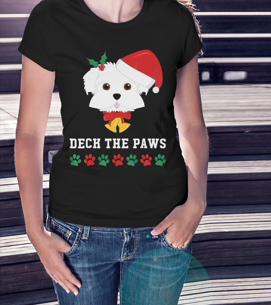 Deck The Paws Christmas Dog Maltese Santa Hat Paw Prints T-Shirt