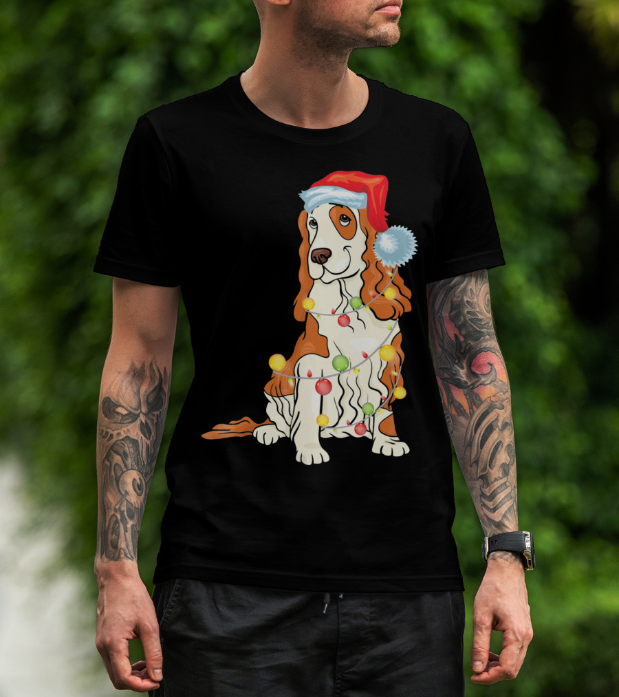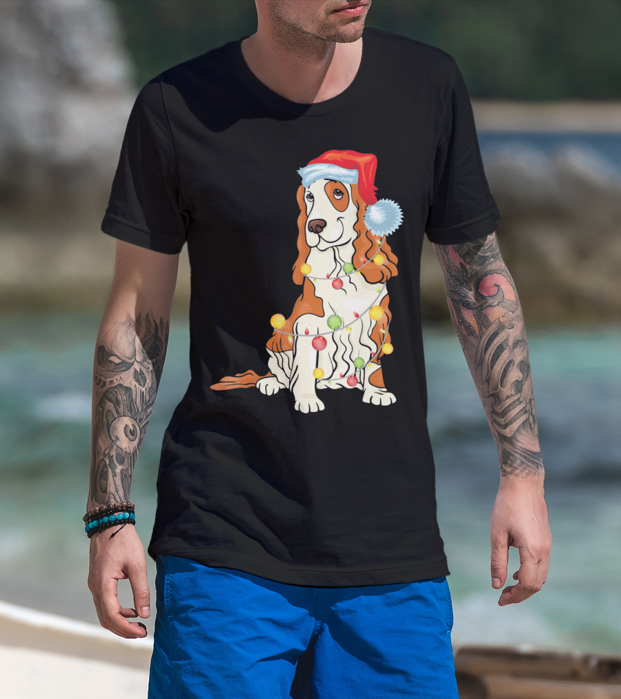 Cocker Spaniel Wearing Santa Hat With Colorful Christmas Lights T-Shirt