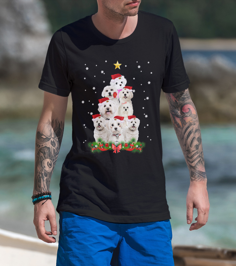 Maltese Dogs Christmas Tree With Santa Hats And Star T-Shirt