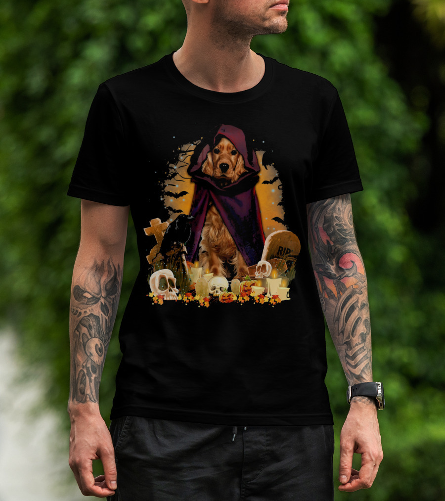 Cocker Spaniel Halloween Hooded Dog With Skulls And Tombstones T-Shirt
