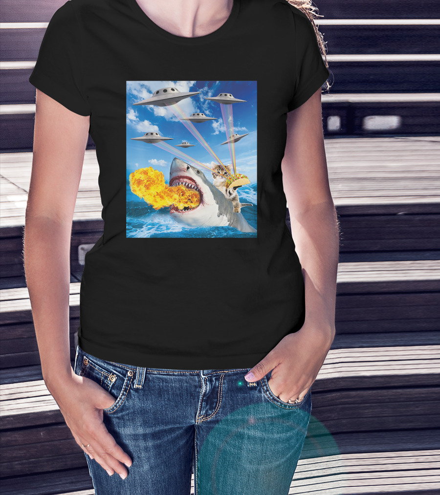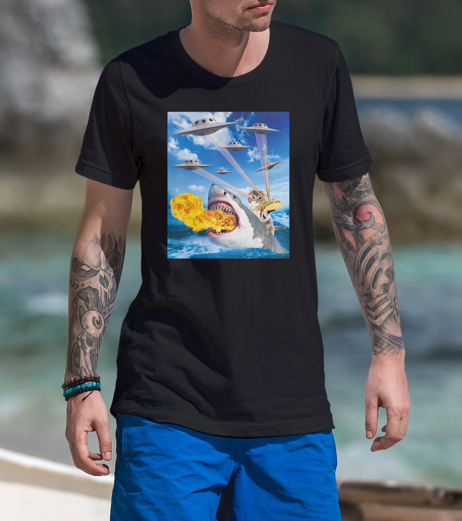 Cat Riding Fire Breathing Shark With UFO Rainbow Lasers And Taco T-Shirt