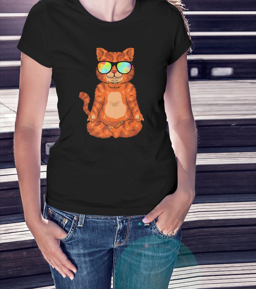 Meditating Cat In Colorful Sunglasses Yoga Pose Cute Drawing T-Shirt