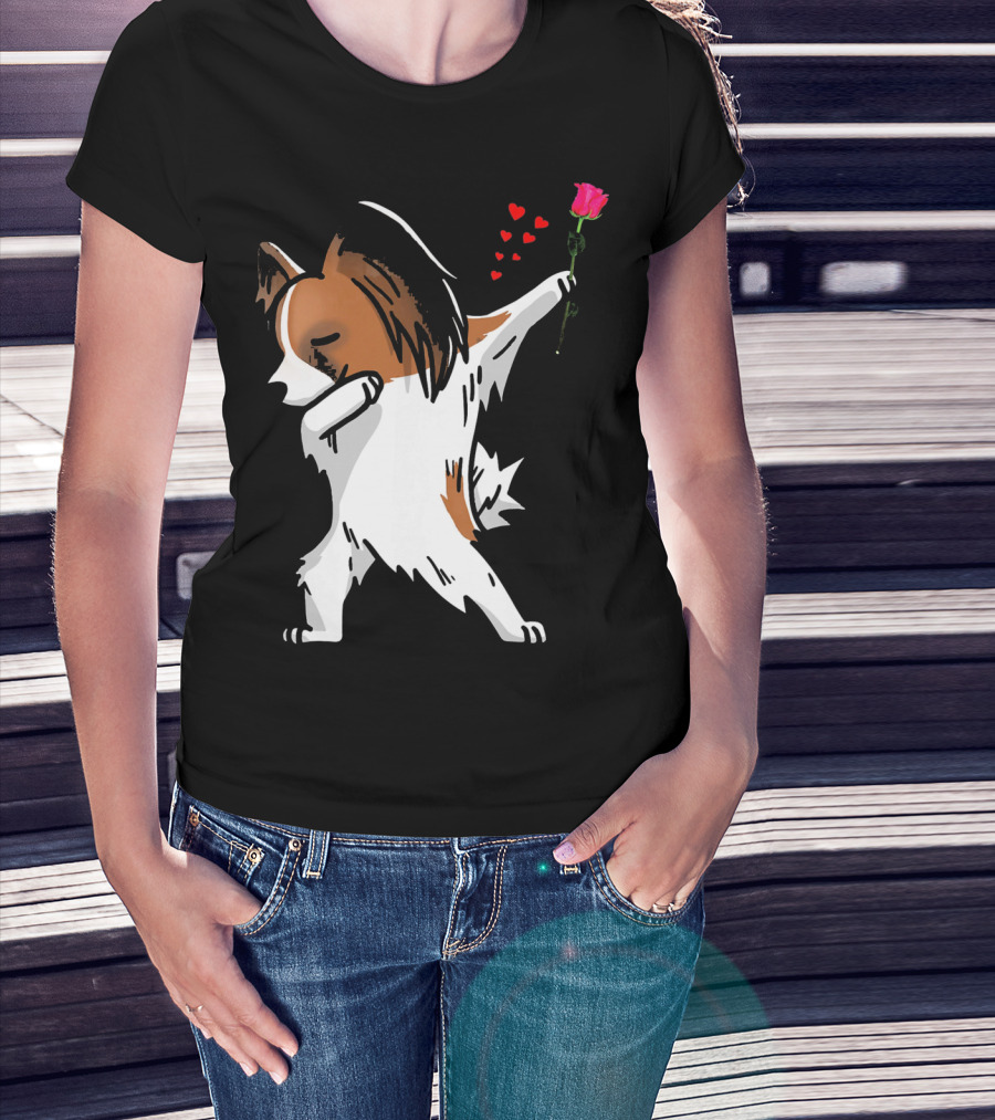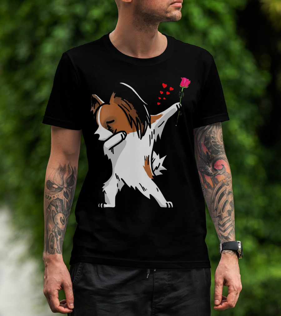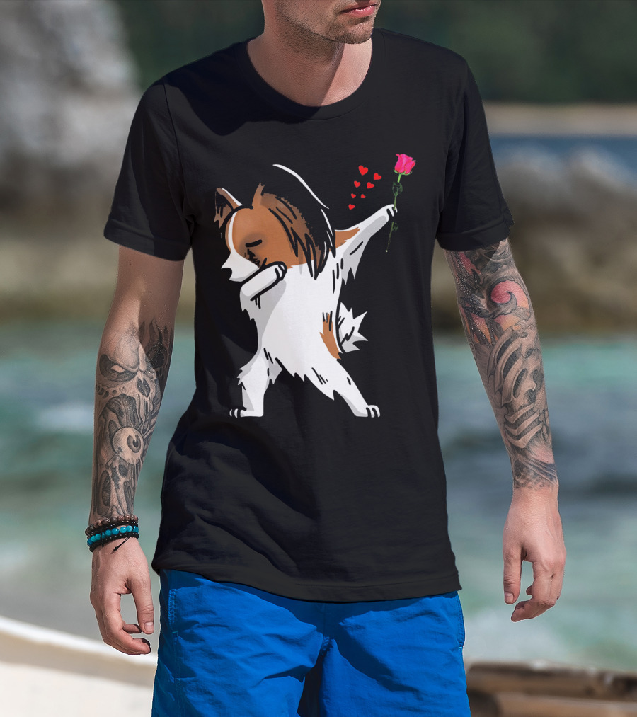 Dabbing Papillon Dog Holding Rose With Hearts For Valentines Day T-Shirt