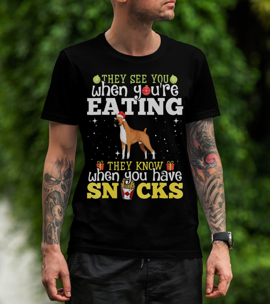 They See You When You're Eating They Know When You Have Snacks Boxer Dog Christmas T-Shirt