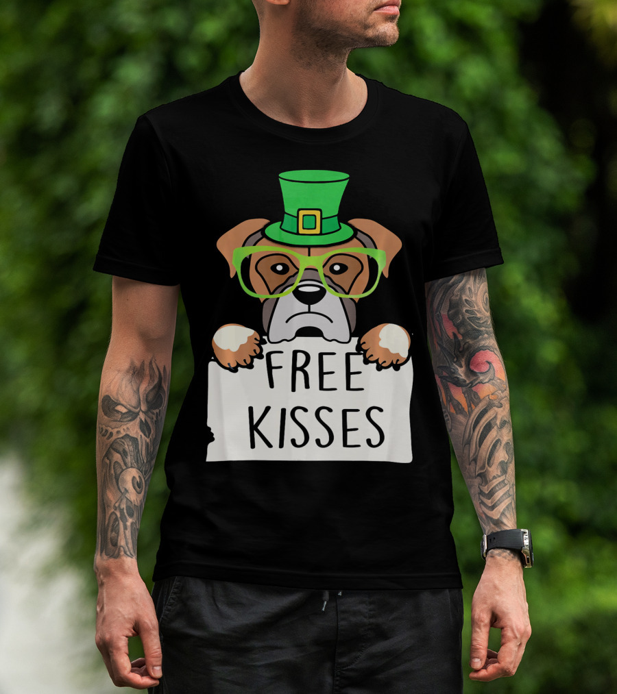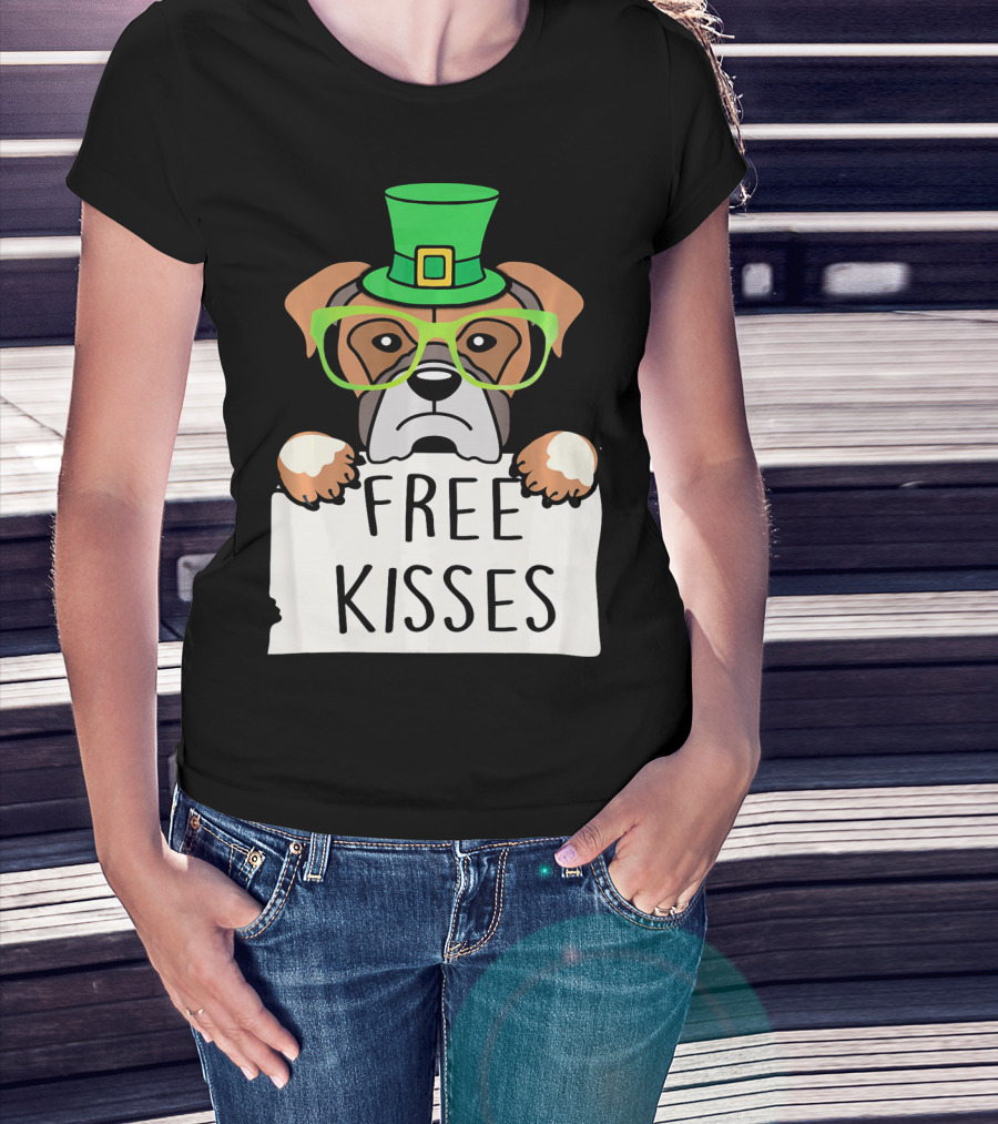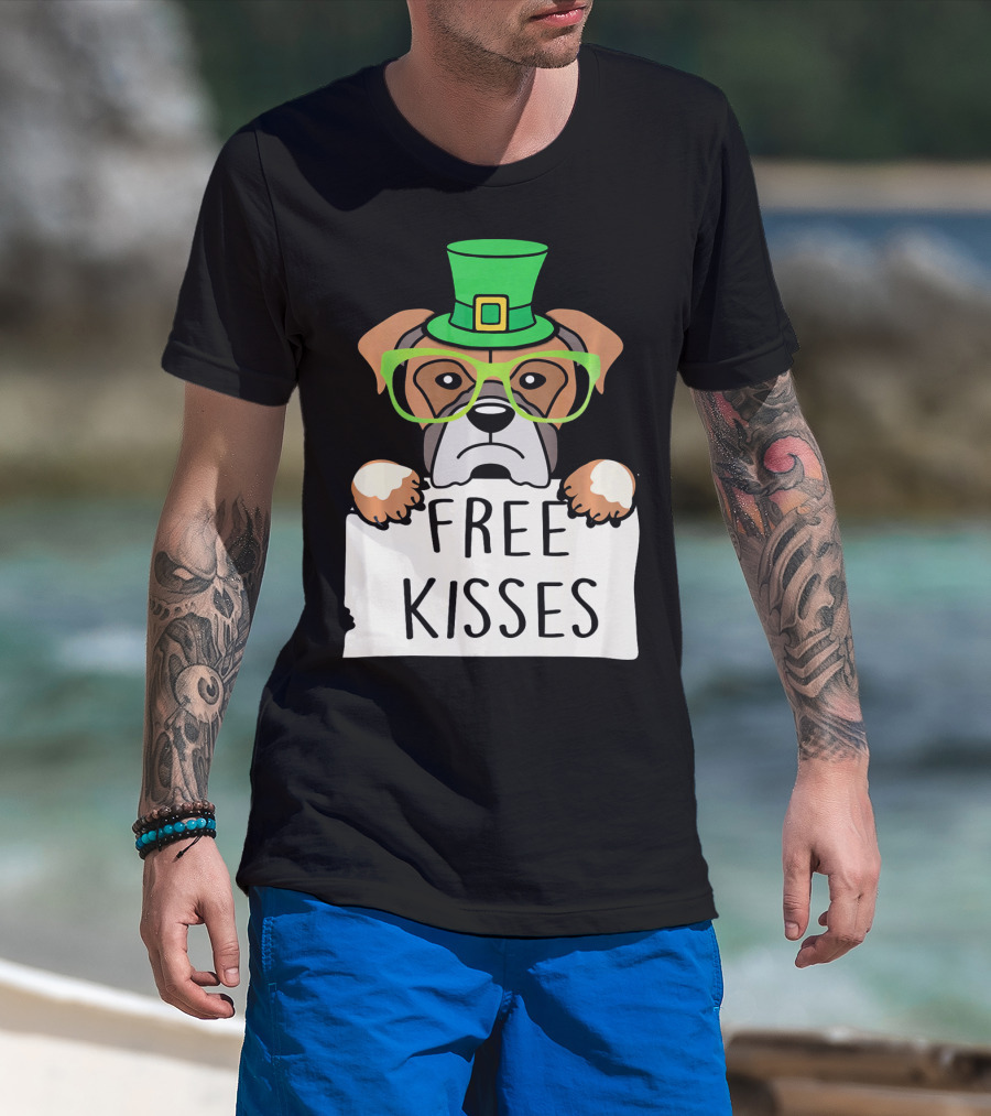 Free Kisses Boxer Dog Leprechaun St Patrick Hat Green Glasses T-Shirt