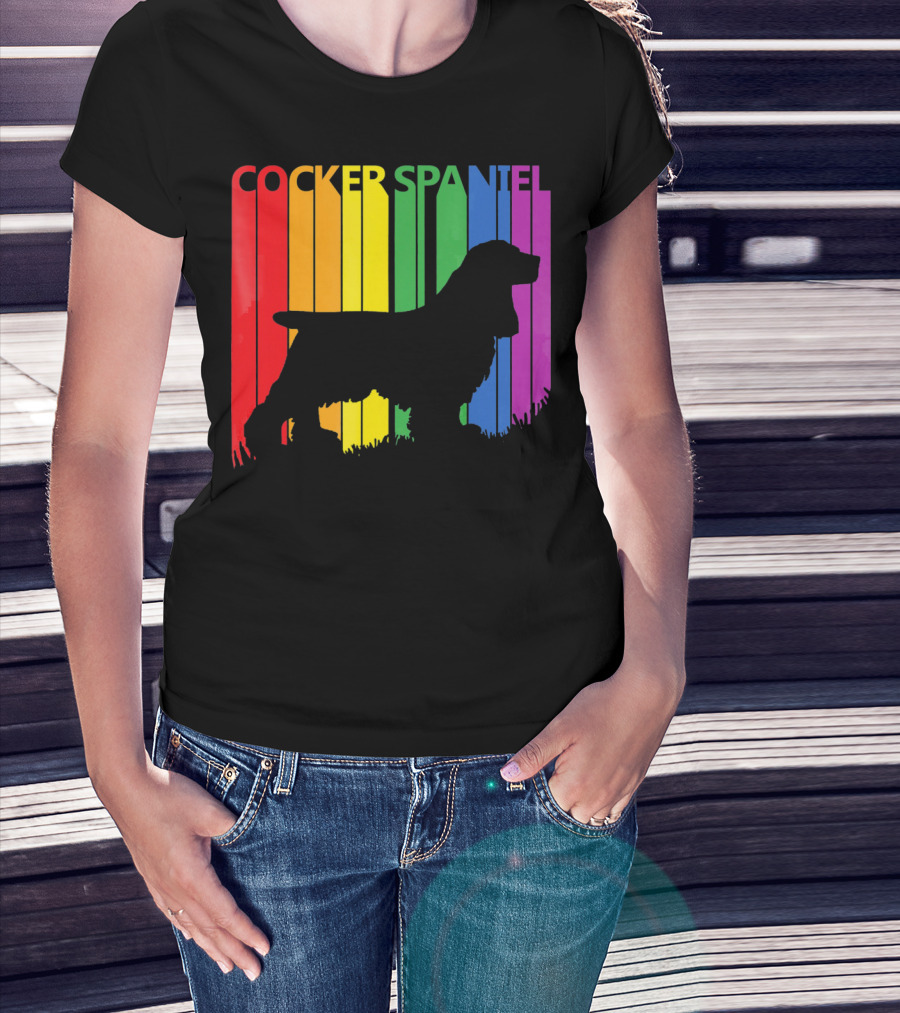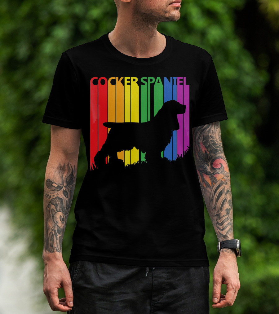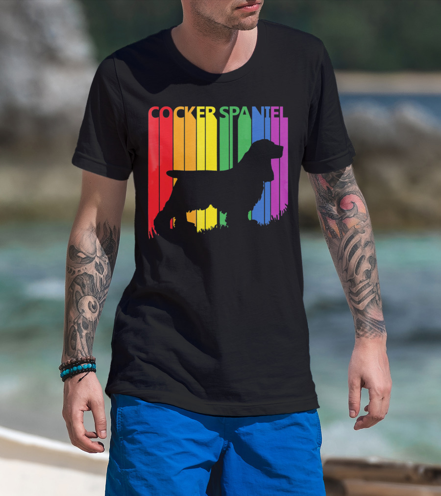 The Cocker Spaniel Rainbow T-shirt is designed for everyday wear and a consistent fit. Fabric is pre-shrunk ring-spun cotton with durable stitching. See the size chart below for exact measurements.