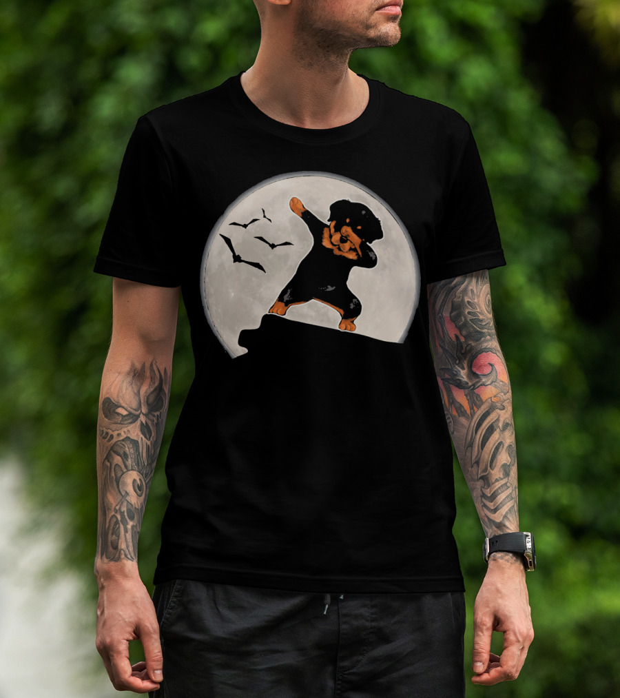 Funny Rottweiler Dabbing Dog Halloween Costume With Moon And Bats T-Shirt