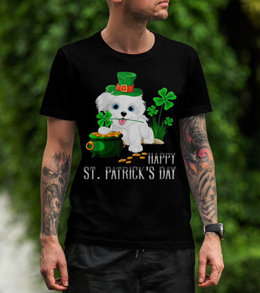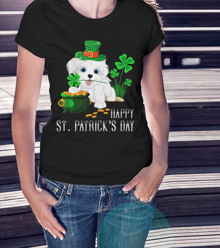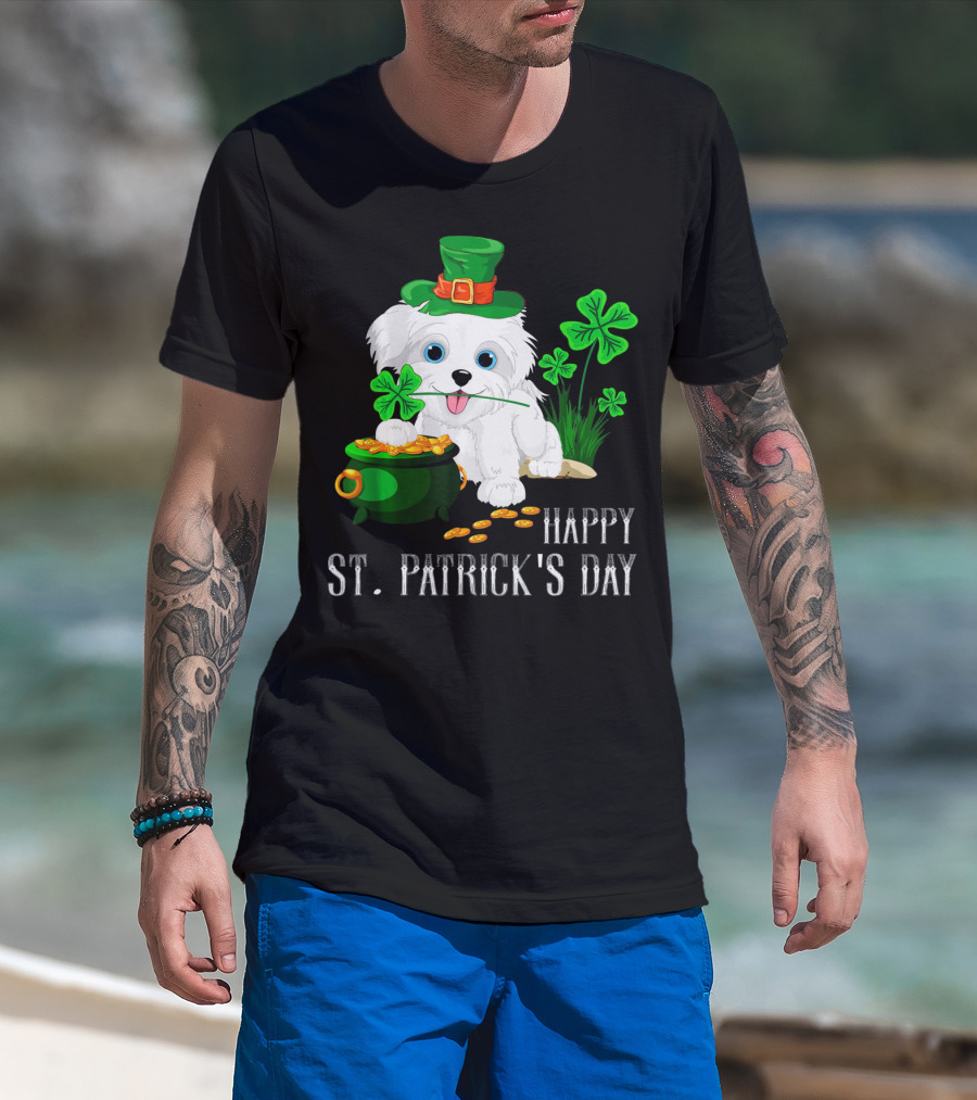 Happy St. Patrick's Day Maltese Dog With Shamrocks And Pot Of Gold T-Shirt
