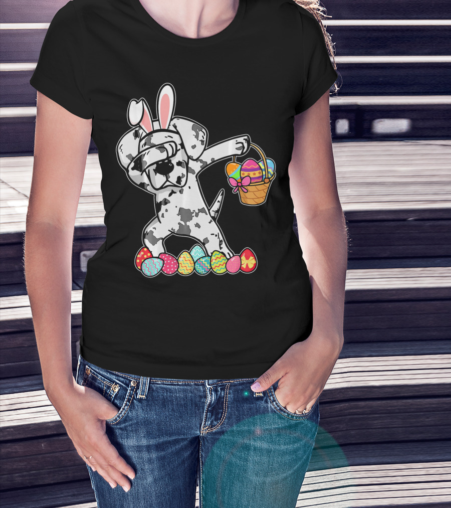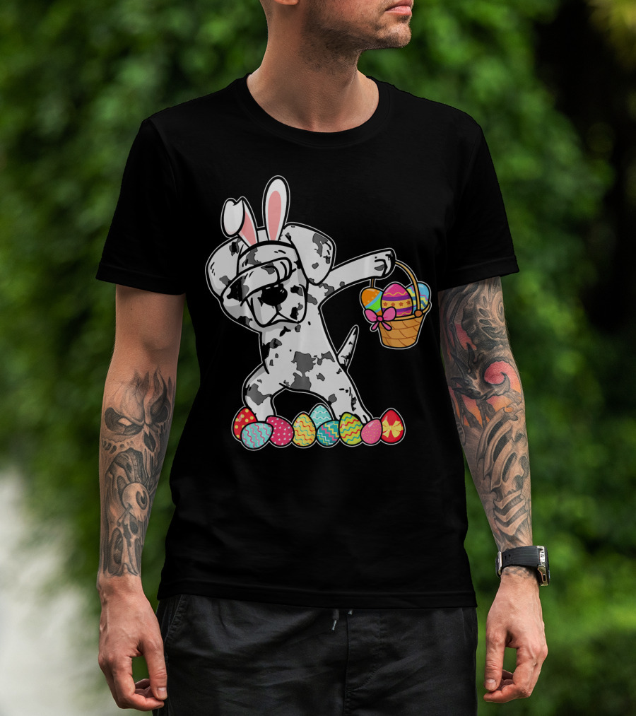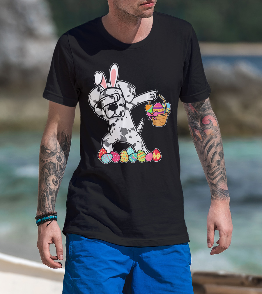 Great Dane Dabbing Easter Bunny With Egg Basket And Colorful Hunting Eggs T-Shirt
