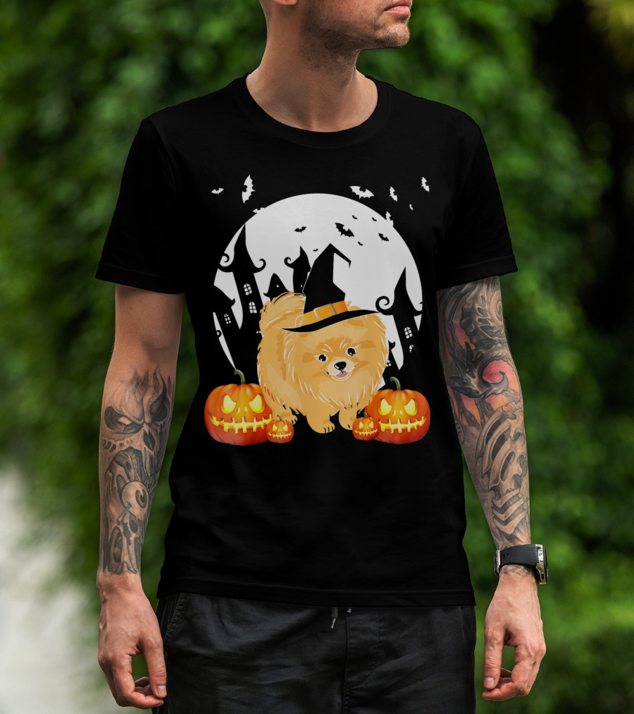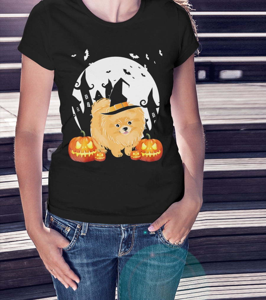 Happy Halloween Little Witch Pomeranian Dog With Pumpkins And Haunted House T-Shirt