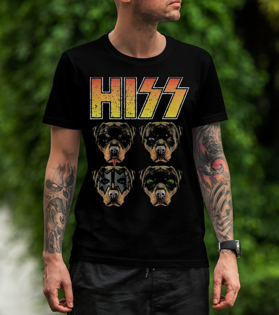 The Hiss Rottweiler Rott Rottie Rockin' Faces T-shirt is designed for everyday wear and a consistent fit. Fabric is pre-shrunk ring-spun cotton with durable stitching. See the size chart below for exact measurements.
