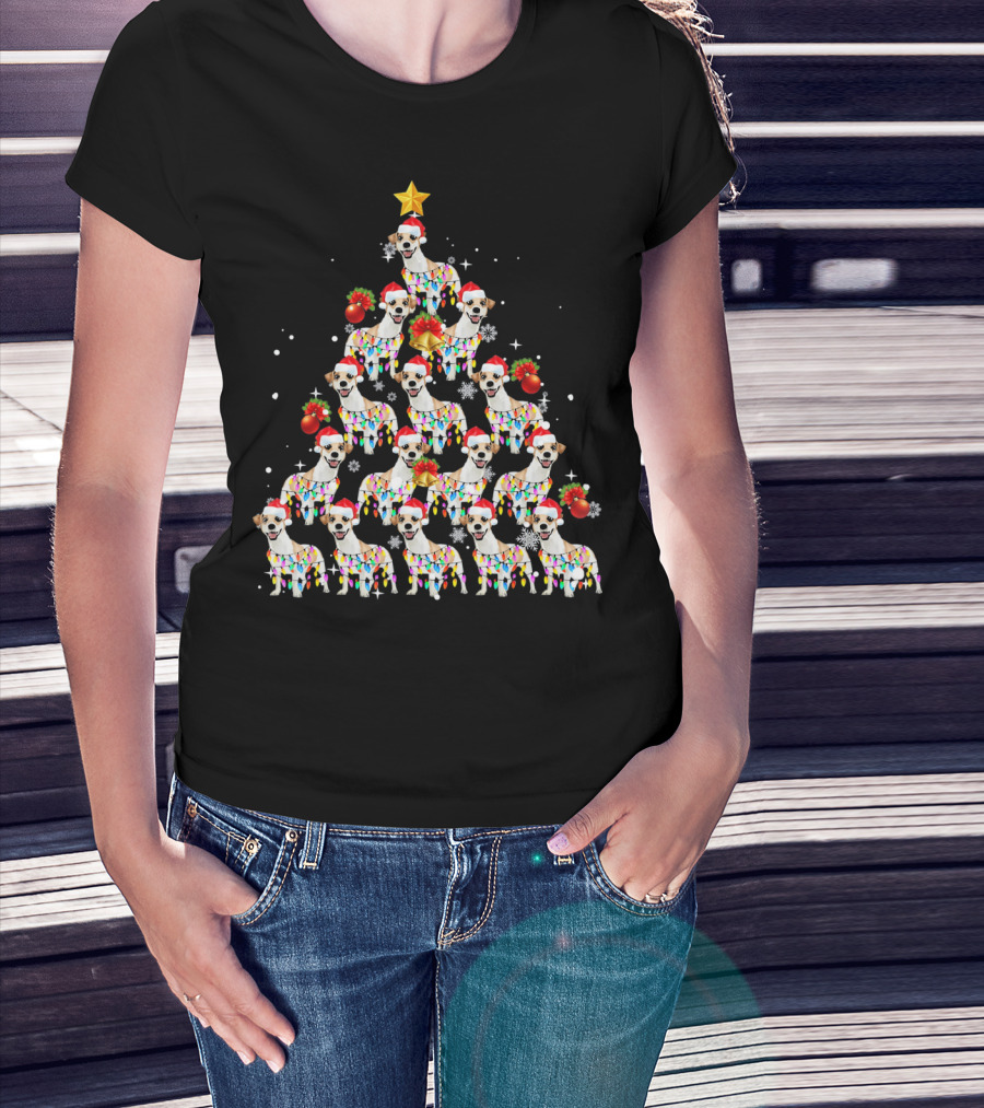 Jack Russell Dog With Santa Hat And Christmas Lights In Tree Shape With Star Decoration T-Shirt