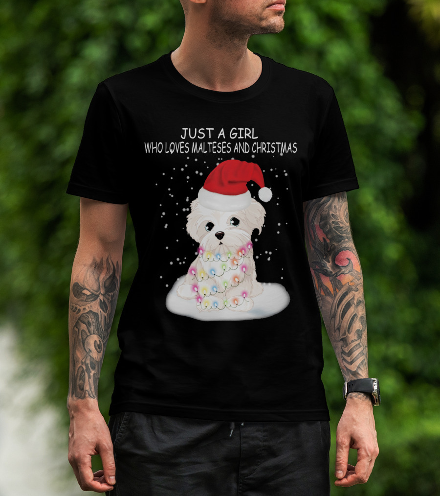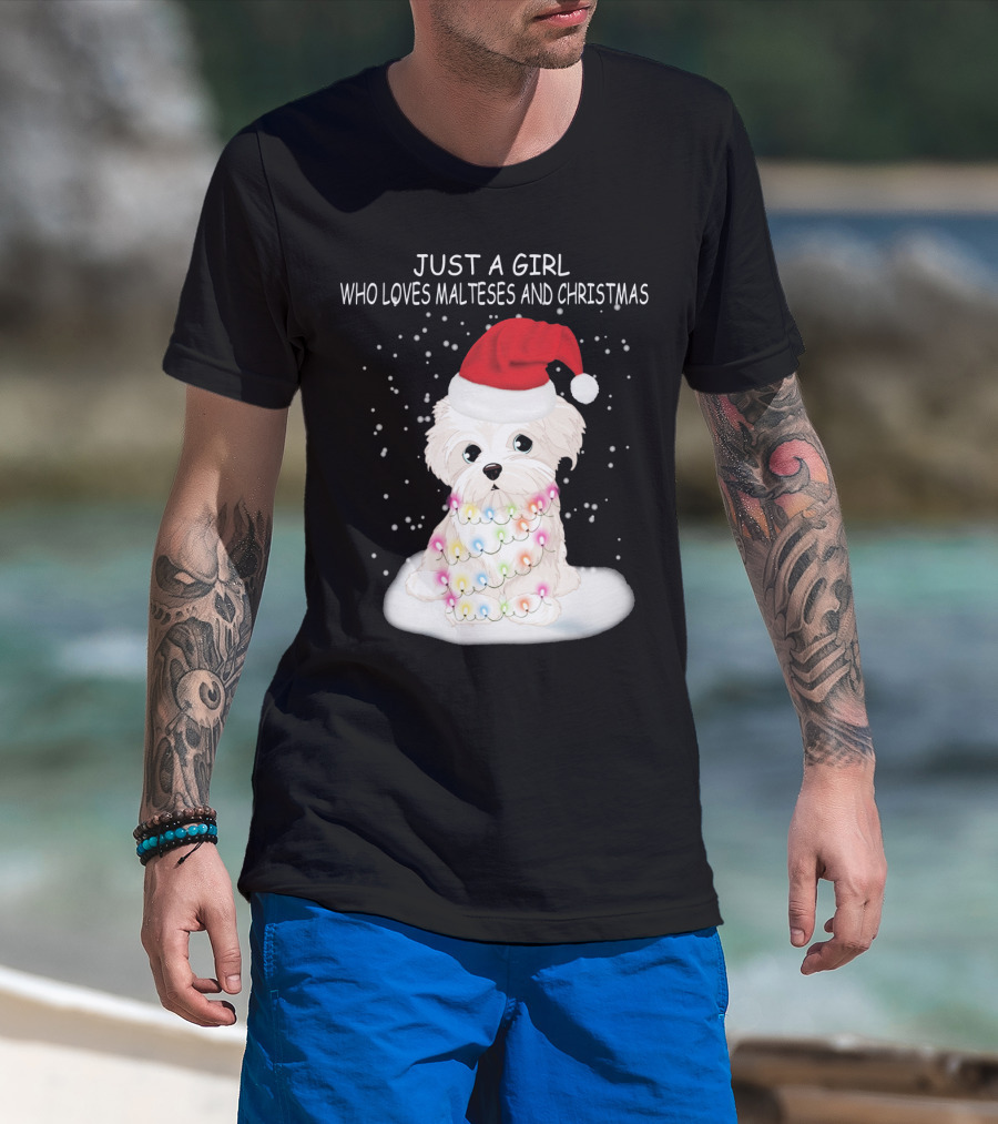 Just A Girl Who Loves Malteses And Christmas Santa Hat Lights T-Shirt