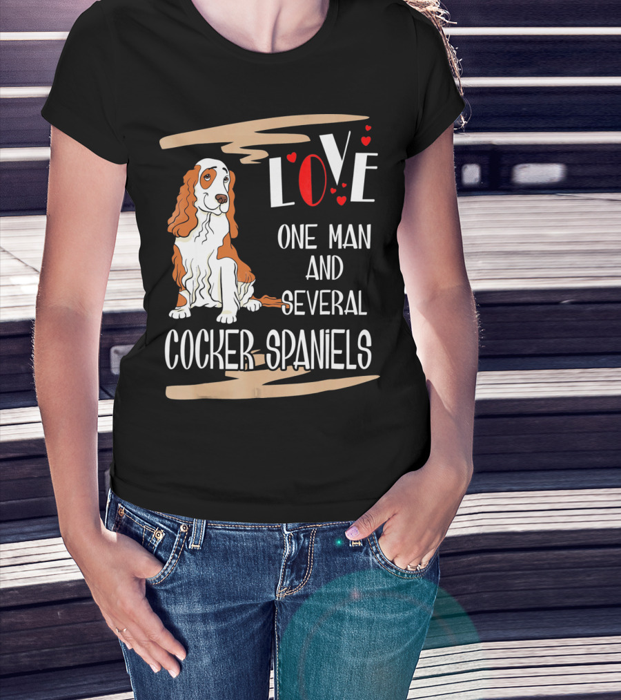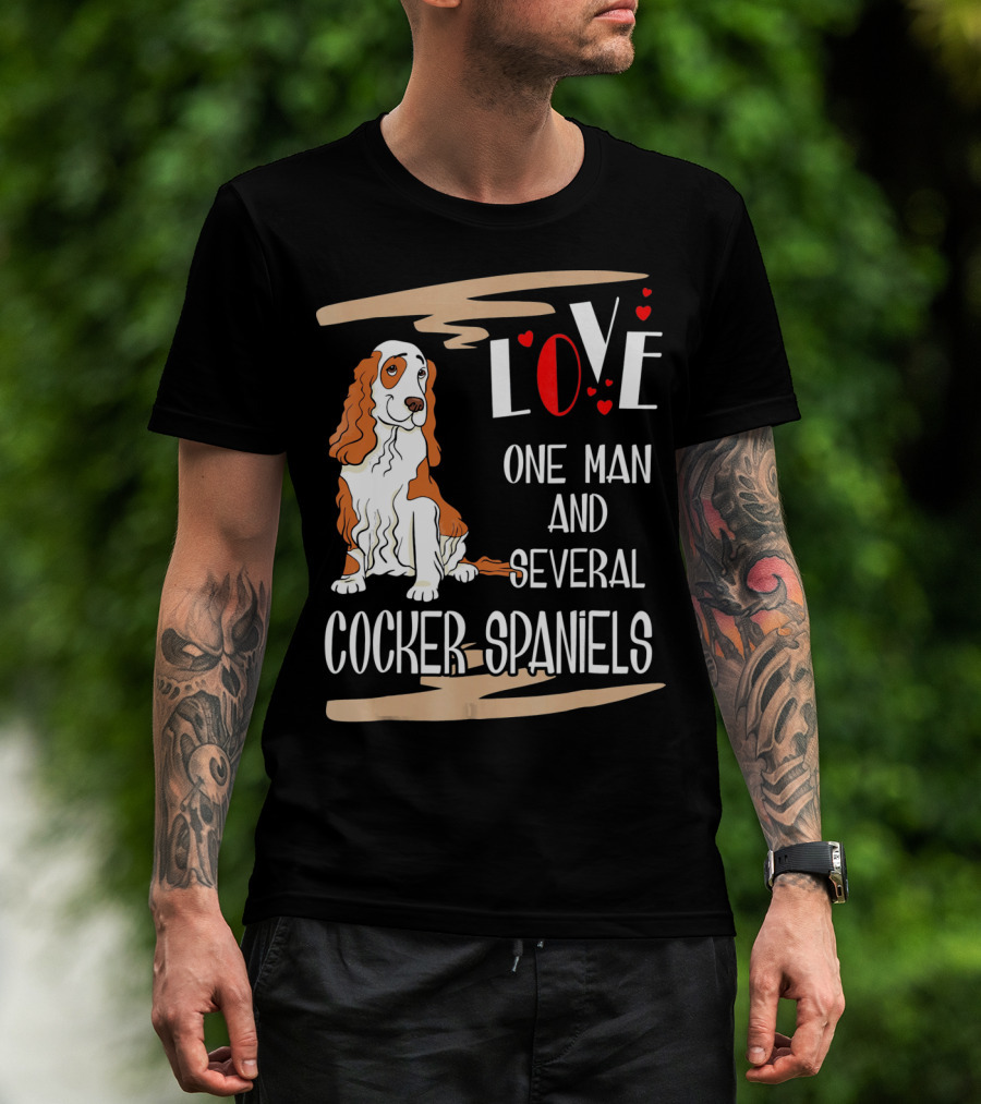 The Love One Man and Several Cocker Spaniels T-shirt is designed for everyday wear and a consistent fit. Fabric is pre-shrunk ring-spun cotton with durable stitching. See the size chart below for exact measurements.