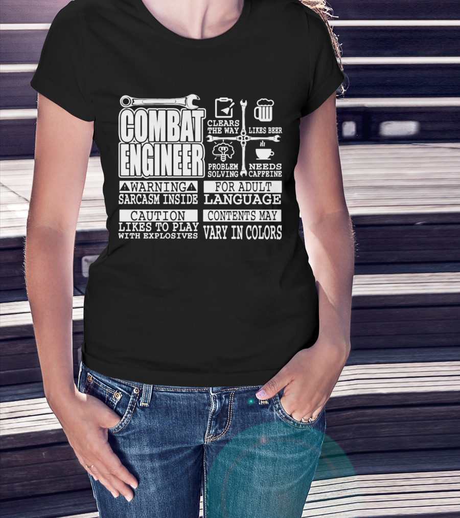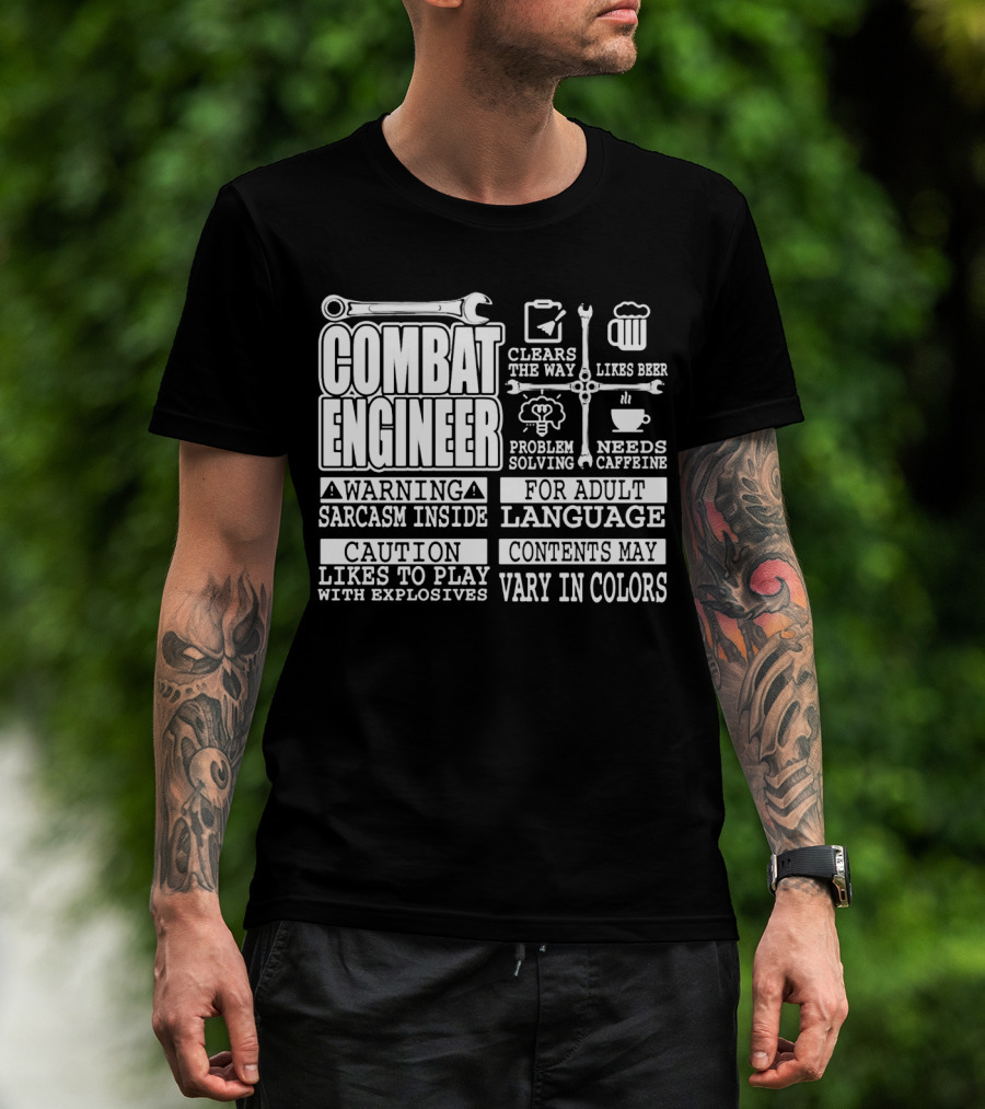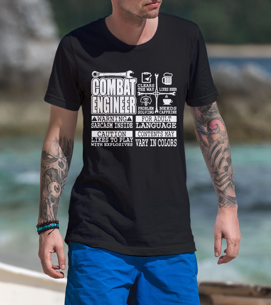 The Combat Engineer Clears the Way Likes Beer Needs Caffeine_warning sarcasm inside Likes to Play with Explosives Problem Solving For Adult Language Contents May Vary in Colors T-shirt is designed for everyday wear and a consistent fit. Fabric is pre-shrunk ring-spun cotton with durable stitching. See the size chart below for exact measurements.