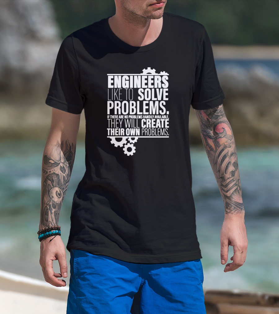 The ENGINEERS LIKE TO SOLVE PROBLEMS IF THERE ARE NO PROBLEMS HANDILY AVAILABLE THEY WILL CREATE THEIR OWN PROBLEMS T-shirt is designed for everyday wear and a consistent fit. Fabric is pre-shrunk ring-spun cotton with durable stitching. See the size chart below for exact measurements.