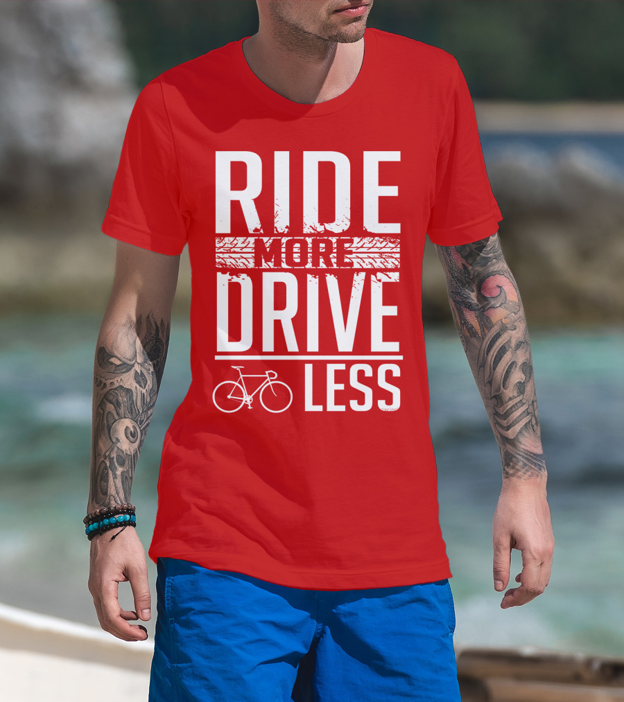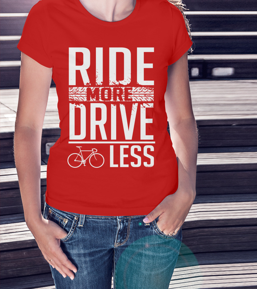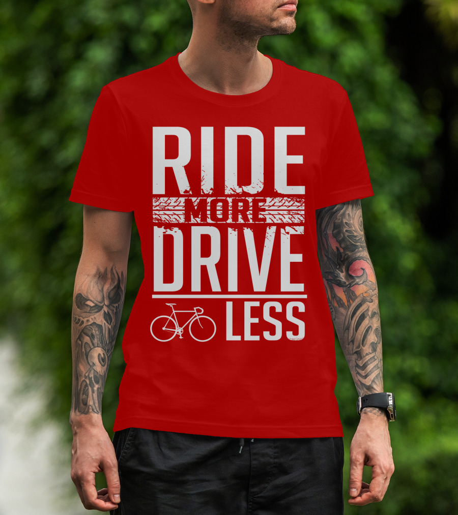 The Ride More Drive Less Bicycle Message T-shirt is designed for everyday wear and a consistent fit. Fabric is pre-shrunk ring-spun cotton with durable stitching. See the size chart below for exact measurements.