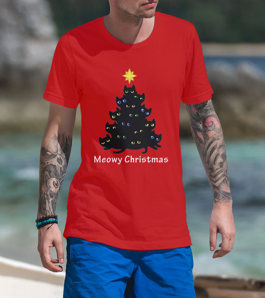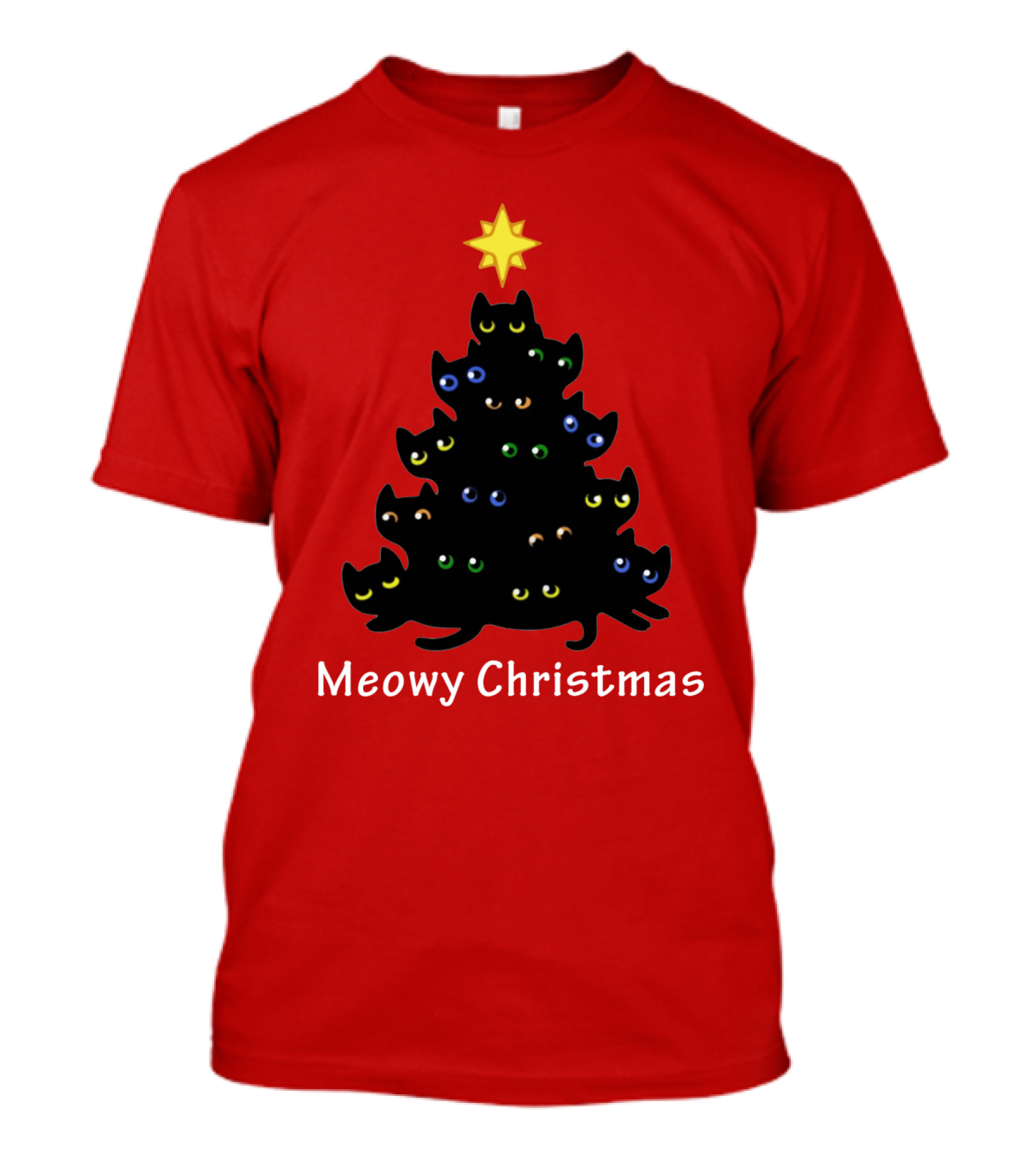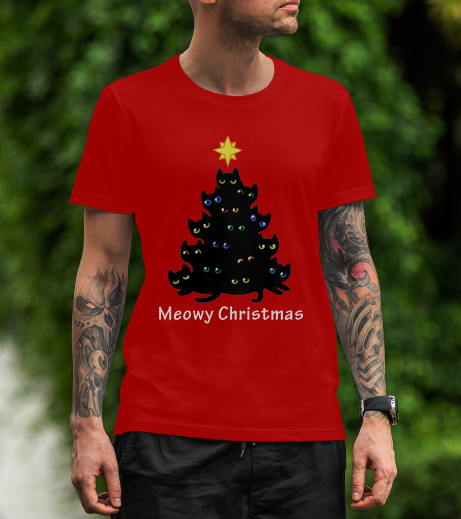 The Meowy Christmas Black Cat Tree T-shirt is designed for everyday wear and a consistent fit. Fabric is pre-shrunk ring-spun cotton with durable stitching. See the size chart below for exact measurements.