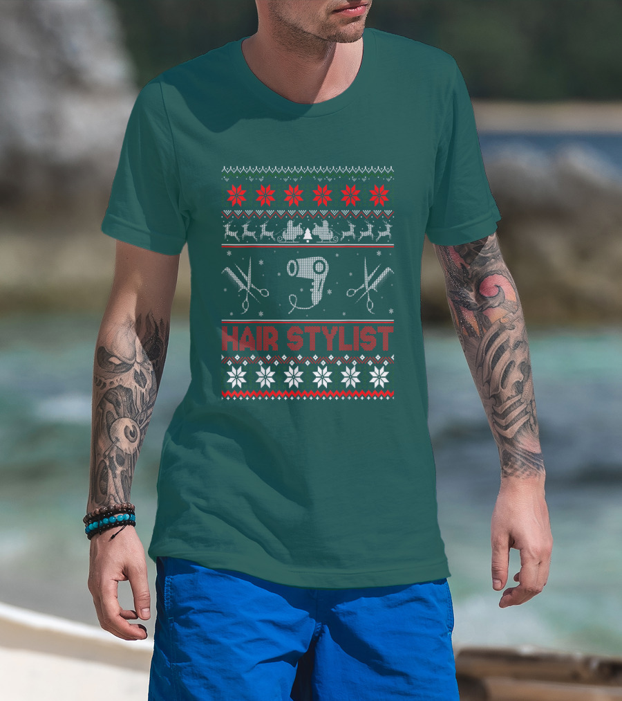 The Hair Stylist Ugly Christmas Sweater Scissors and Hairdryer T-shirt is designed for everyday wear and a consistent fit. Fabric is pre-shrunk ring-spun cotton with durable stitching. See the size chart below for exact measurements.