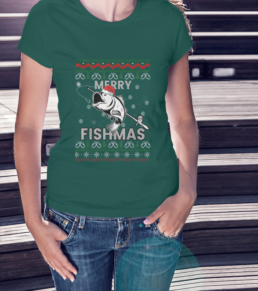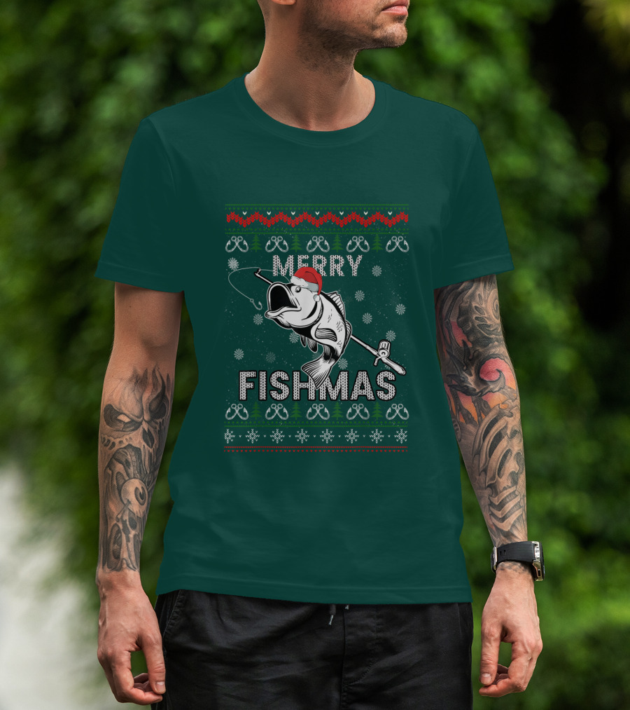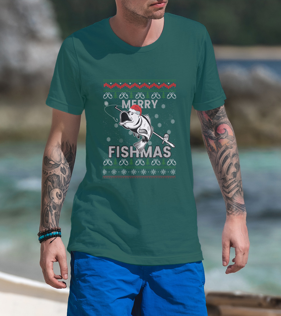 Merry Fishmas Fishing Santa Hat Bass Ugly Christmas T-Shirt