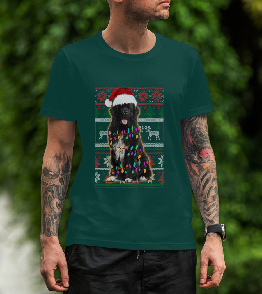 Newfoundland Dog Christmas Lights Santa Hat Ugly T-Shirt