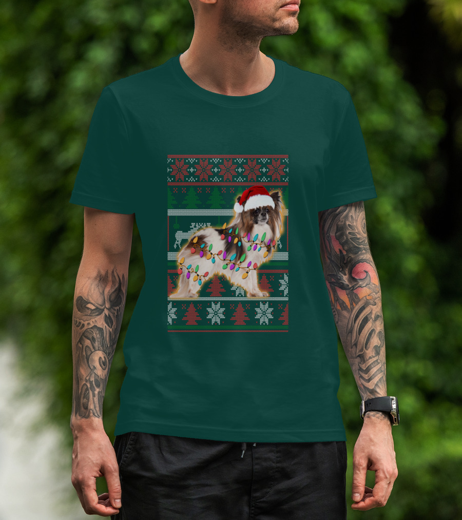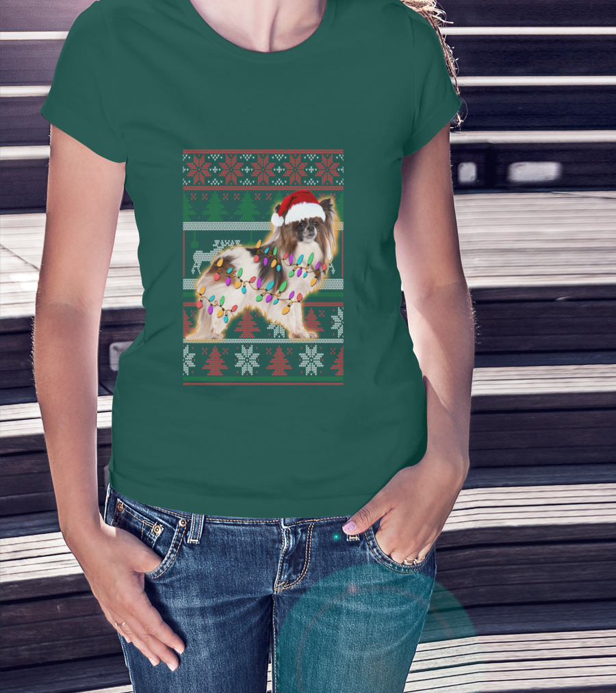 Papillon Dog In Christmas Sweater With Lights And Santa Hat T-Shirt