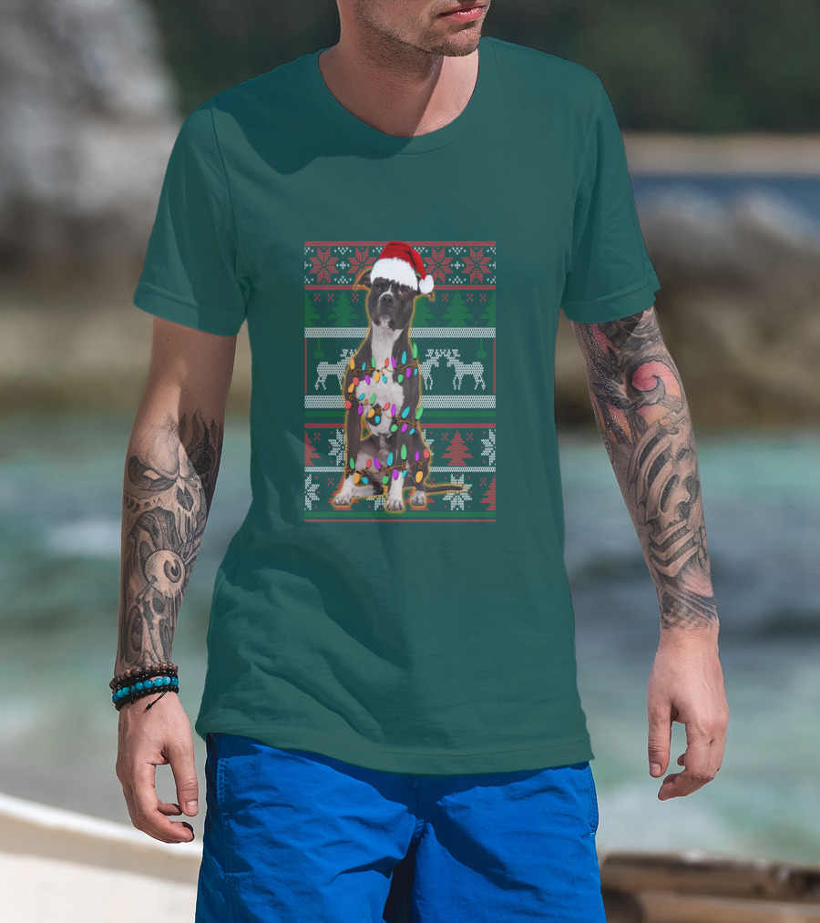 Pitbull Christmas Sweater With Santa Hat And Holiday Lights T-Shirt